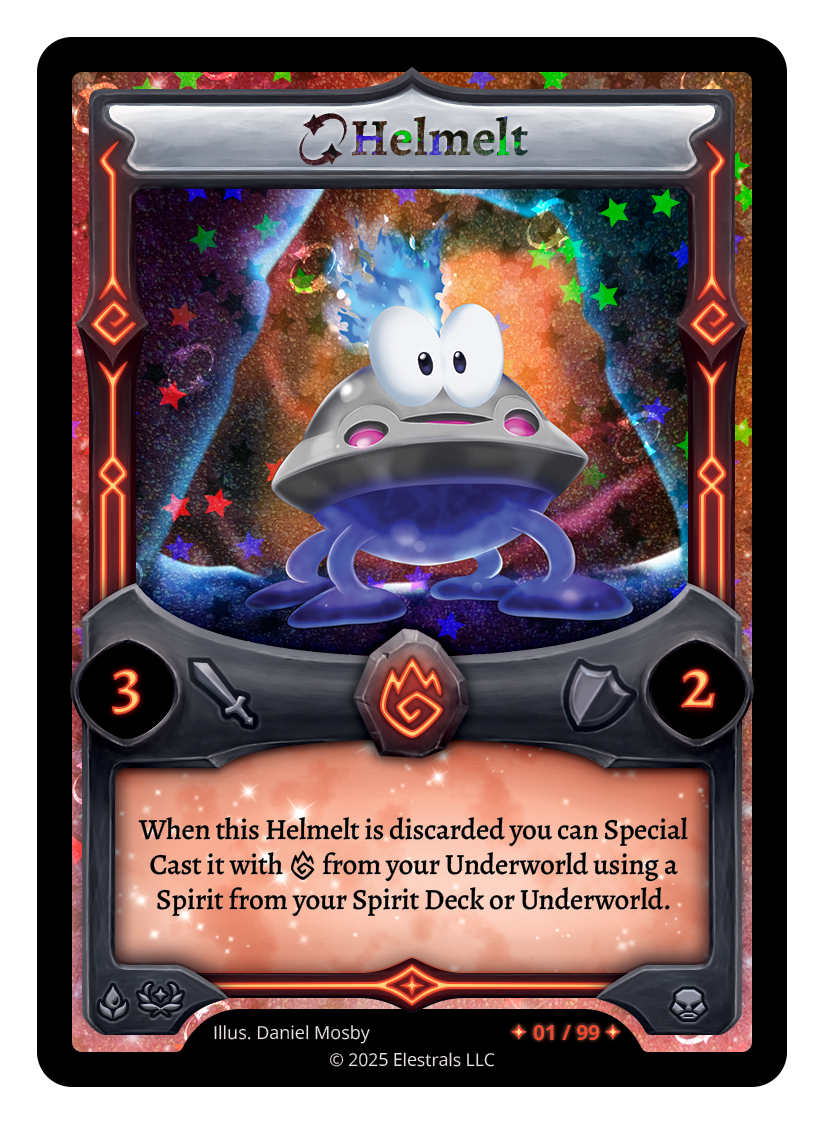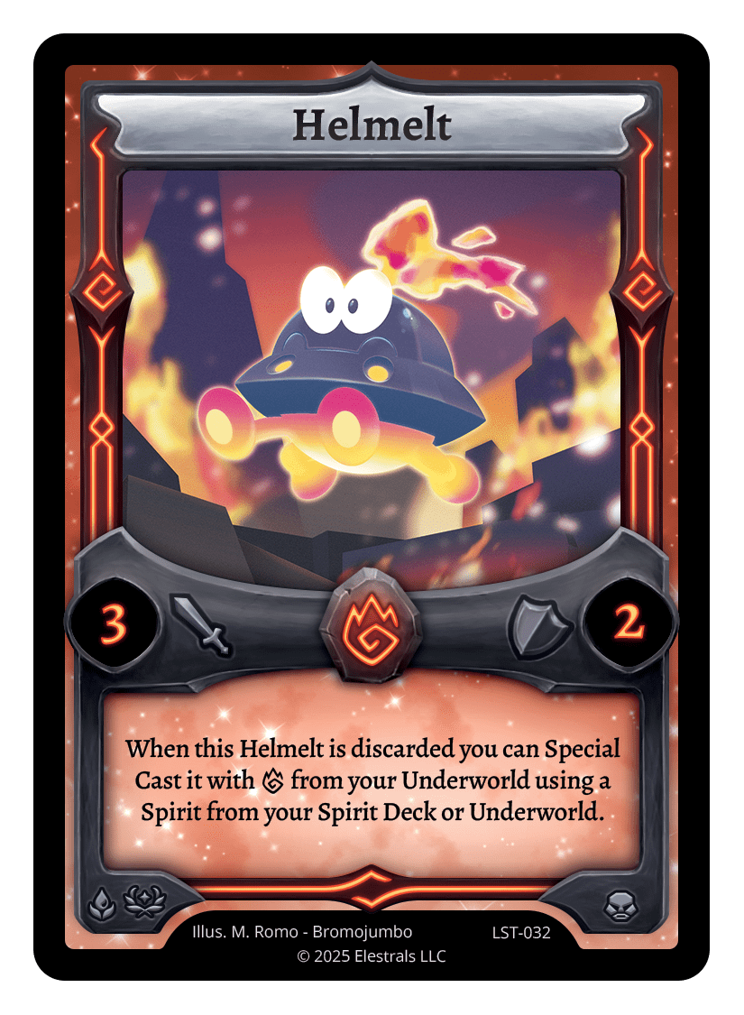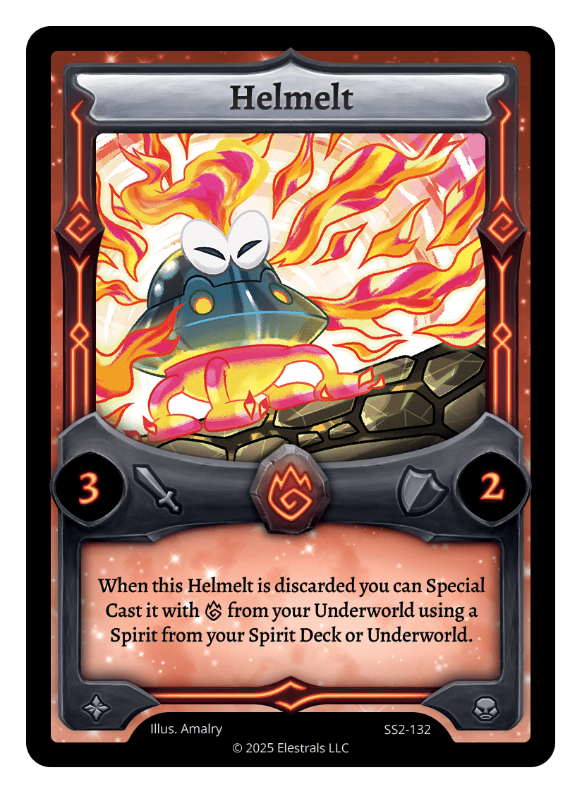 Helmelt❮❯❮❯❮❯XX/99LST-032SS2-132TypeElestralCostFireElementsFireAttack3Defense2Card TextWhen this Helmelt is discarded you can Special Cast it from your Underworld with {F} using a Spirit from your Spirit Deck or Underworld.SubclassesGolem