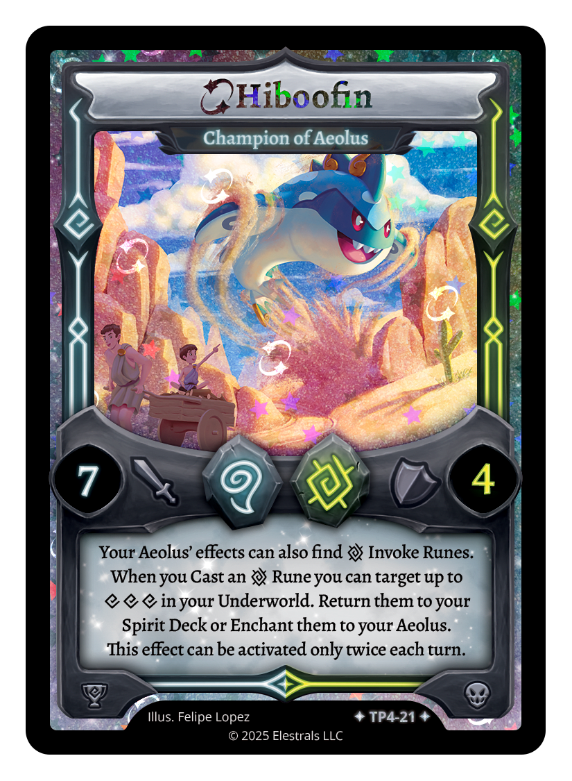 Your Aeolus' effects can also find {E} Invoke Runes. When you Cast an {E} Rune you can target up to {XXX} in your Underworld. Return them to your Spirit Deck or Enchant them to your Aeolus. This effect can be activated only twice each turn.