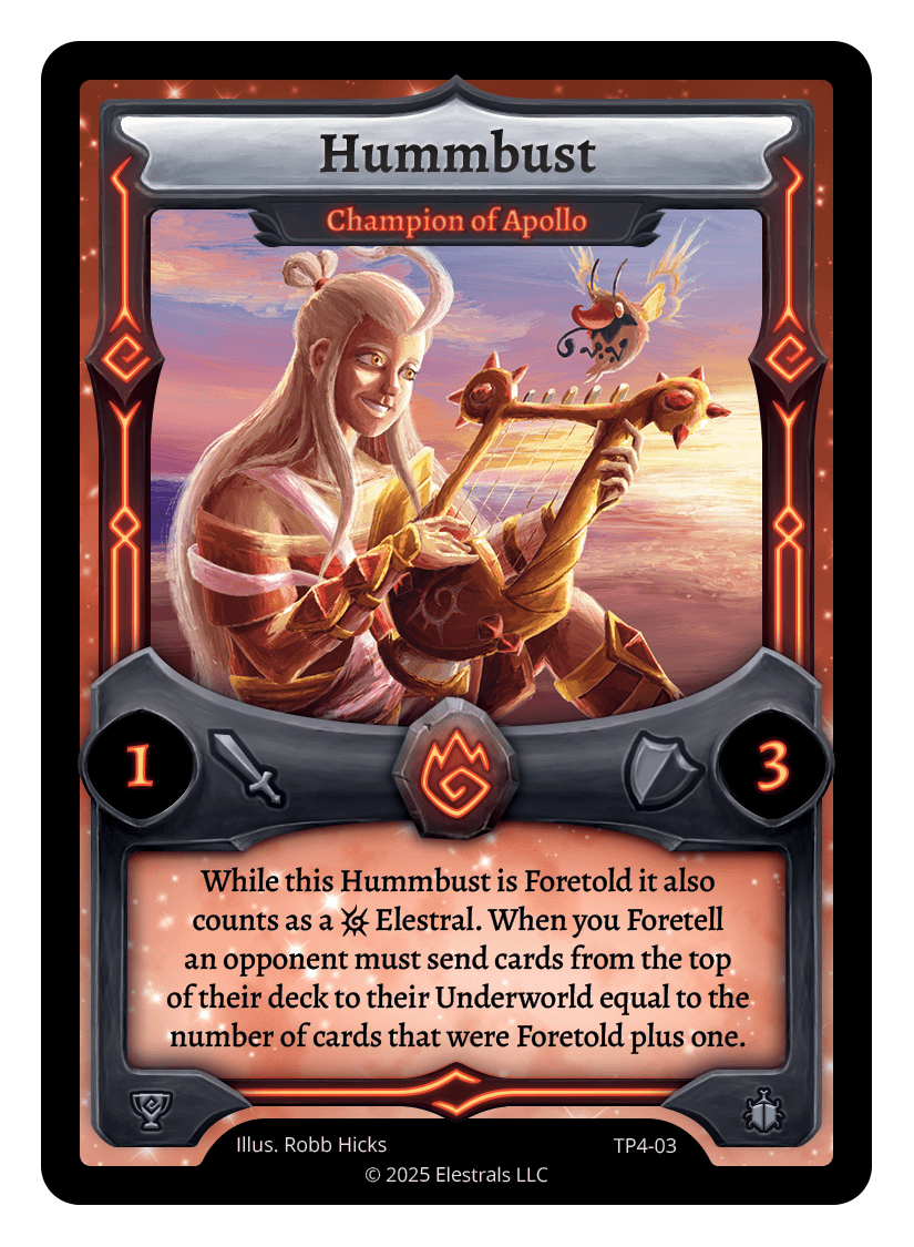 While this Hummbust is Foretold it also counts as a {L} Elestral. When you Foretell an opponent must send cards from the top of their deck to their Underworld equal to the number of cards that were Foretold plus 1.