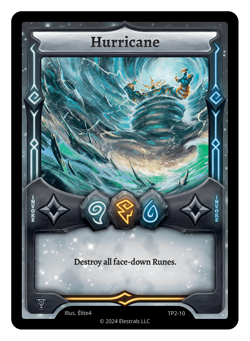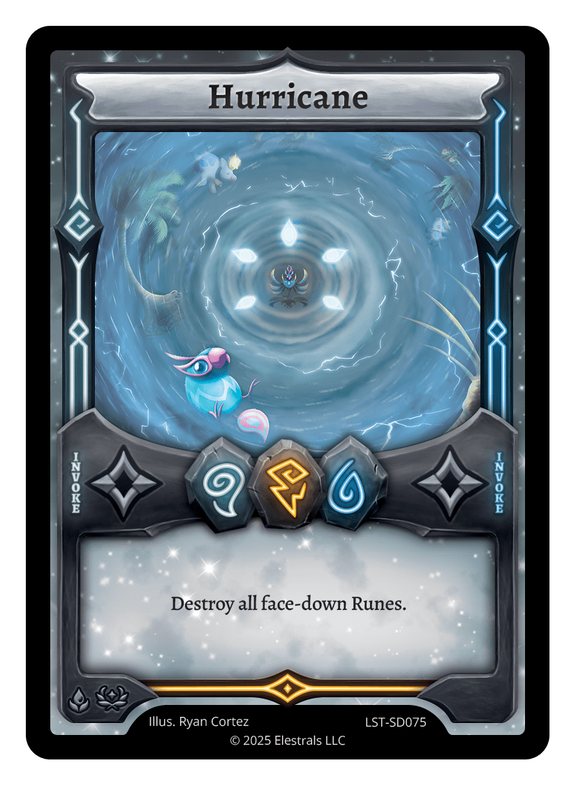 Hurricane❮❯❮❯❮❯❮❯MR1-090TP2-10FST-SD091LST-SD075TypeRuneInvokeCostWindThunderWaterElementsWindThunderWaterCard TextDestroy all face-down Runes.