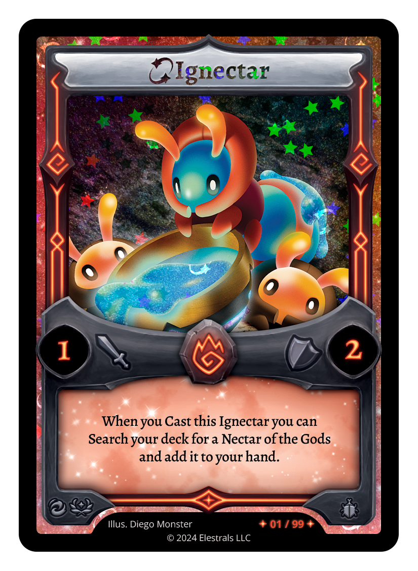 Ignectar (FST)❮❯❮❯FST-026XX/99TypeElestralCostFireElementsFireAttack1Defense2Card TextWhen you Cast this Ignectar you can Search your deck for a Nectar of the Gods and add it to your hand.SubclassesInsectoid