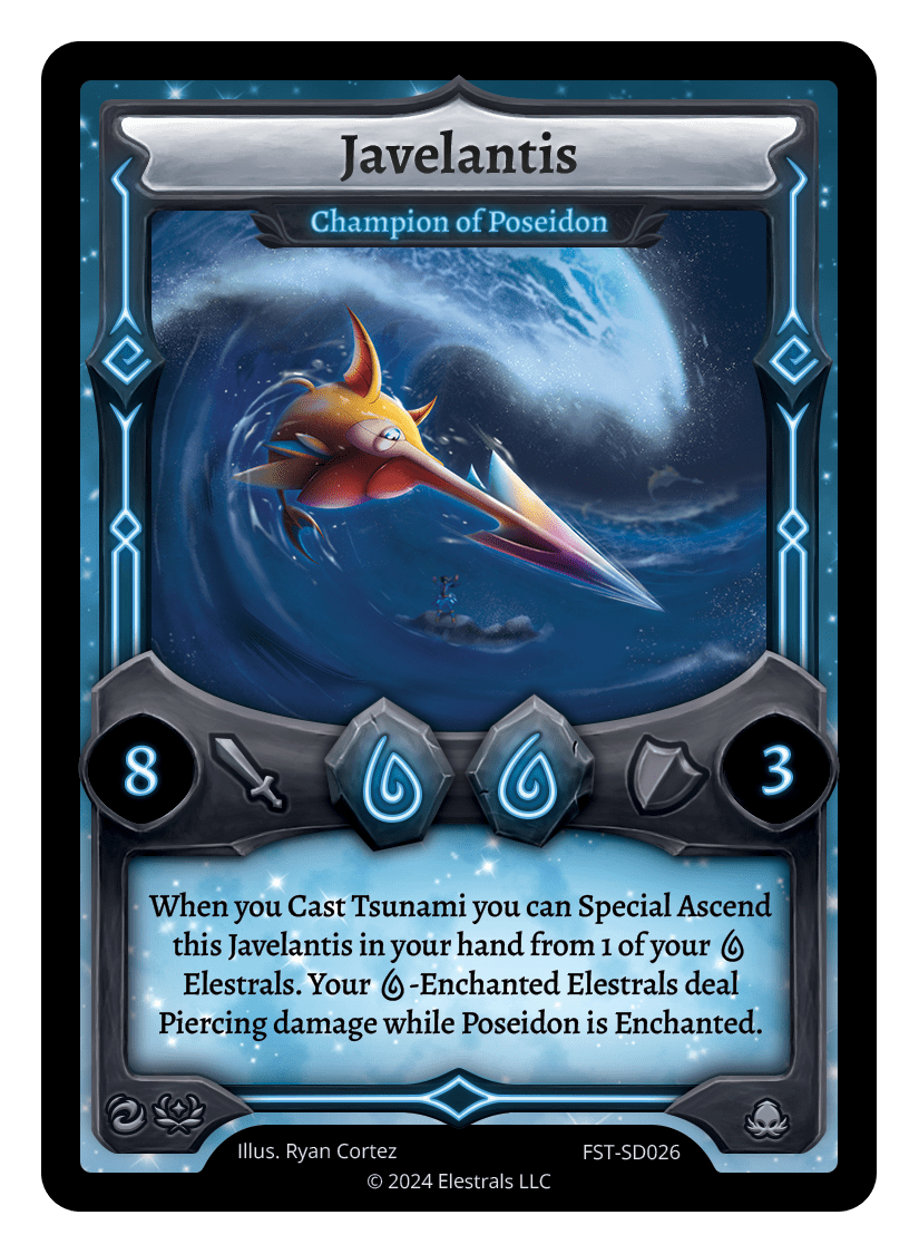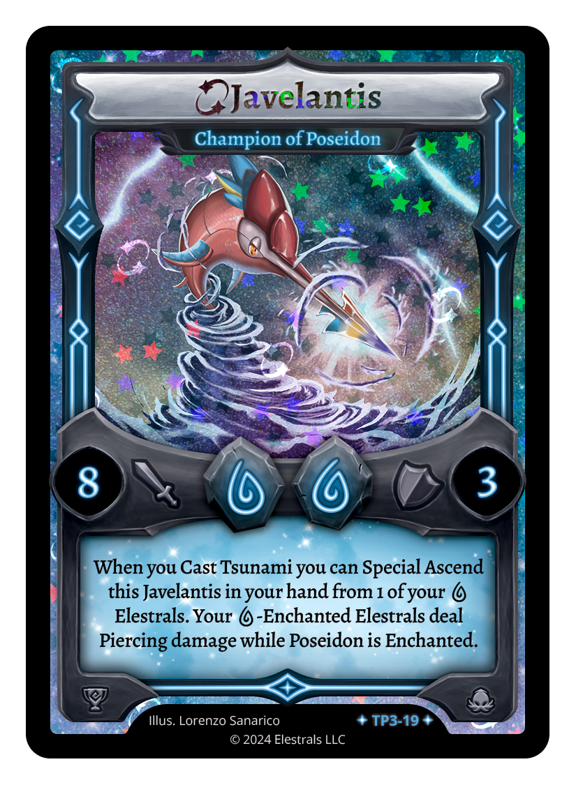 When you Cast Tsunami you can Special Ascend this Javelantis in your hand from one of your {W} Elestrals. Your {W}-Enchanted Elestrals deal Piercing damage while Poseidon is Enchanted.