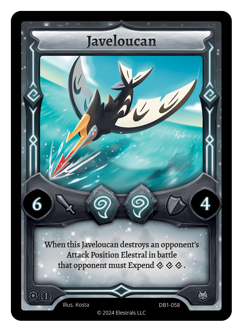 Javeloucan❮❯DB1-058TypeElestralCostWindWindElementsWindAttack6Defense4Card TextWhen this Javeloucan destroys an opponent's Attack Position Elestral in battle that opponent must Expend {XXX}.SubclassesAvian