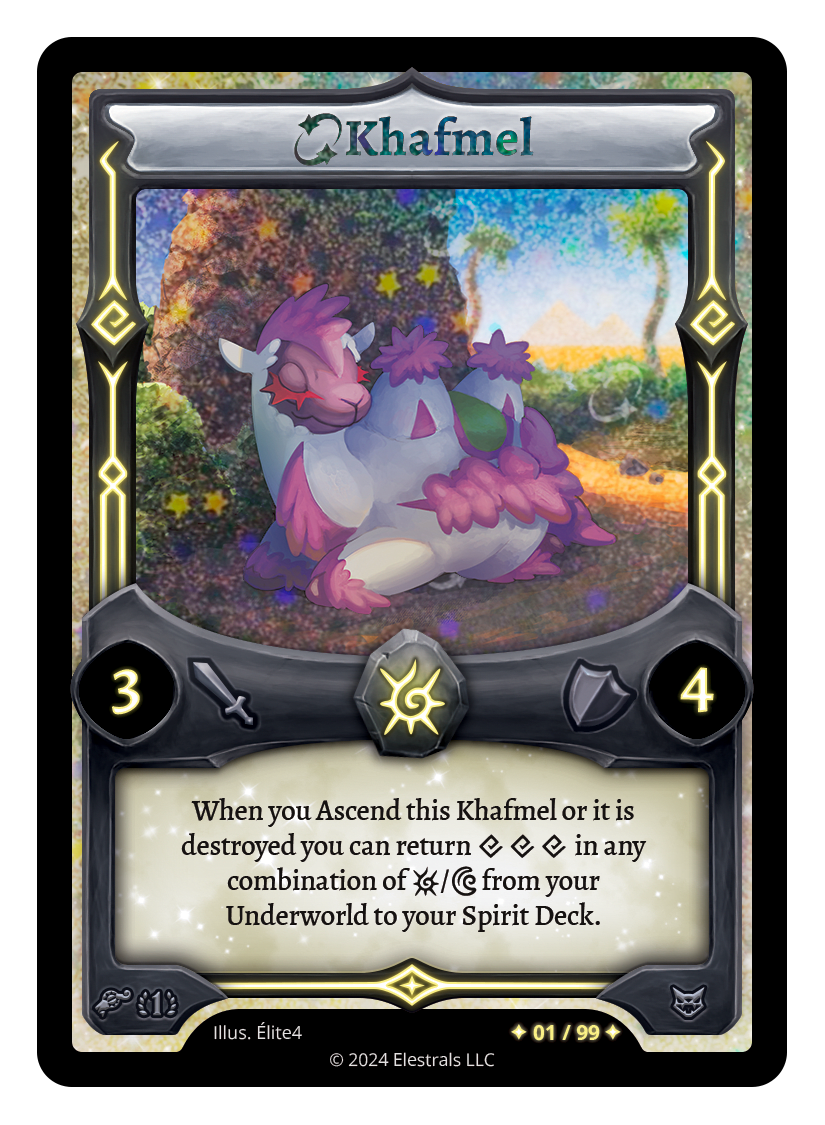 Khafmel❮❯❮❯❮❯❮❯❮❯DB1-025XX/99SD09-01SS1-71SST-SD059TypeElestralCostSolarElementsSolarAttack3Defense4Card TextWhen you Ascend this Khafmel or it is destroyed you can return {XXX} in any combination of {L}/{D} from your Underworld to your Spirit Deck.SubclassesBrute