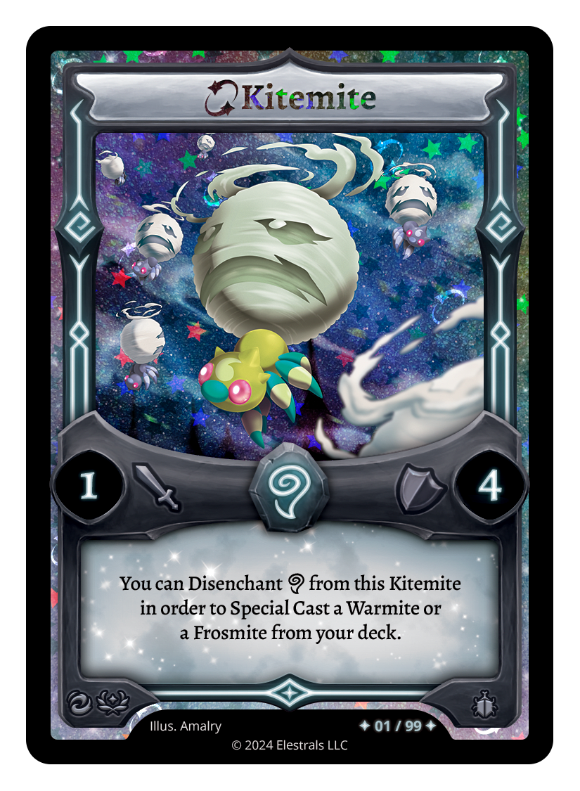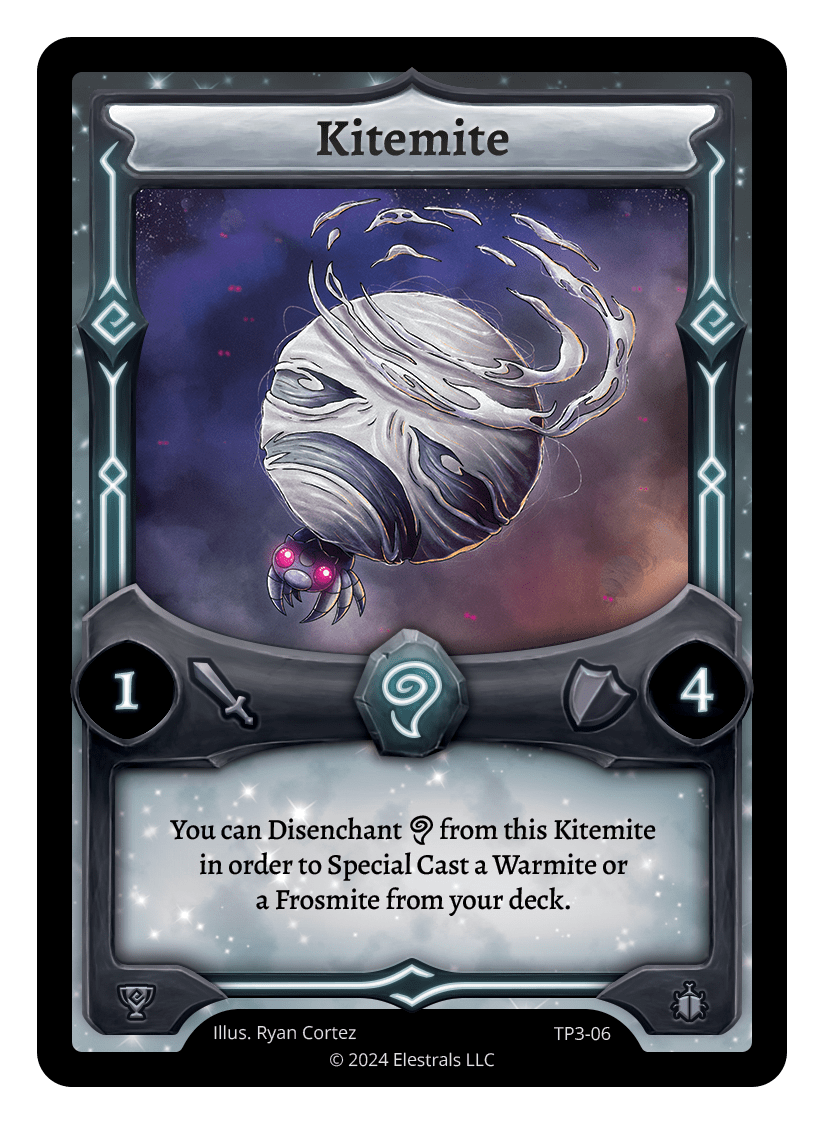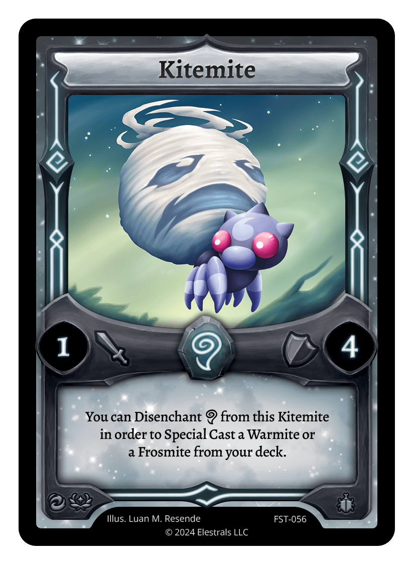 Kitemite❮❯❮❯❮❯XX/99FST-056TP3-06TypeElestralCostWindElementsWindAttack1Defense4Card TextYou can Disenchant {A} from this Kitemite in order to Special Cast a Warmite or a Frosmite from your deck.SubclassesInsectoid