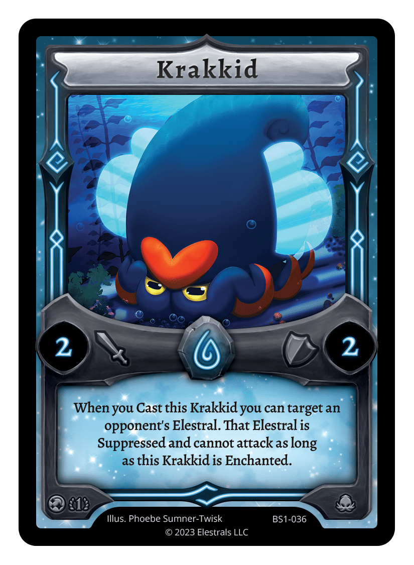 Krakkid❮❯❮❯BS1-036BS1-036TypeElestralCostWaterElementsWaterAttack2Defense2Card TextWhen you Cast this Krakkid you can target an opponent's Elestral. That Elestral is Suppressed and cannot attack as long as this Krakkid is Enchanted.SubclassesOceanic