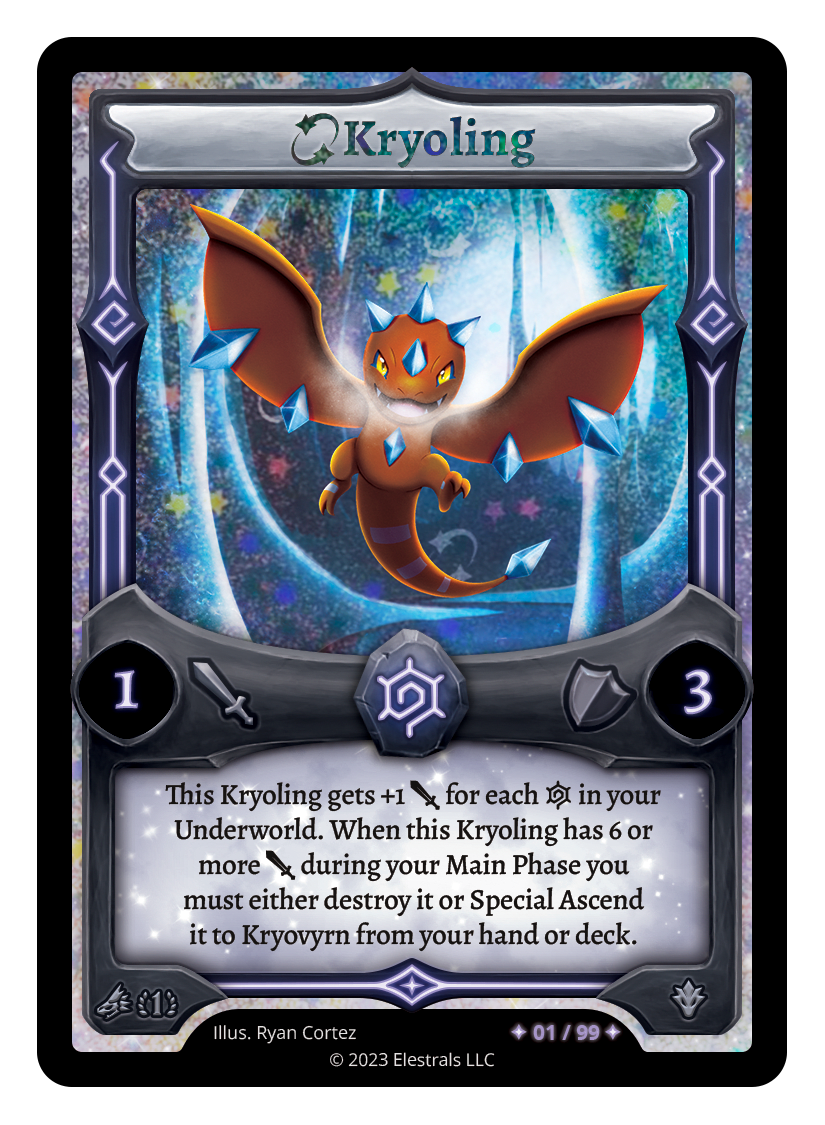 This Kryoling gets +1 {J} for each {I} in your Underworld. When this Kryoling has 6 or more {J} during your Main Phase you must either destroy it or Special Ascend it to Kryovyrn from your hand or deck.
