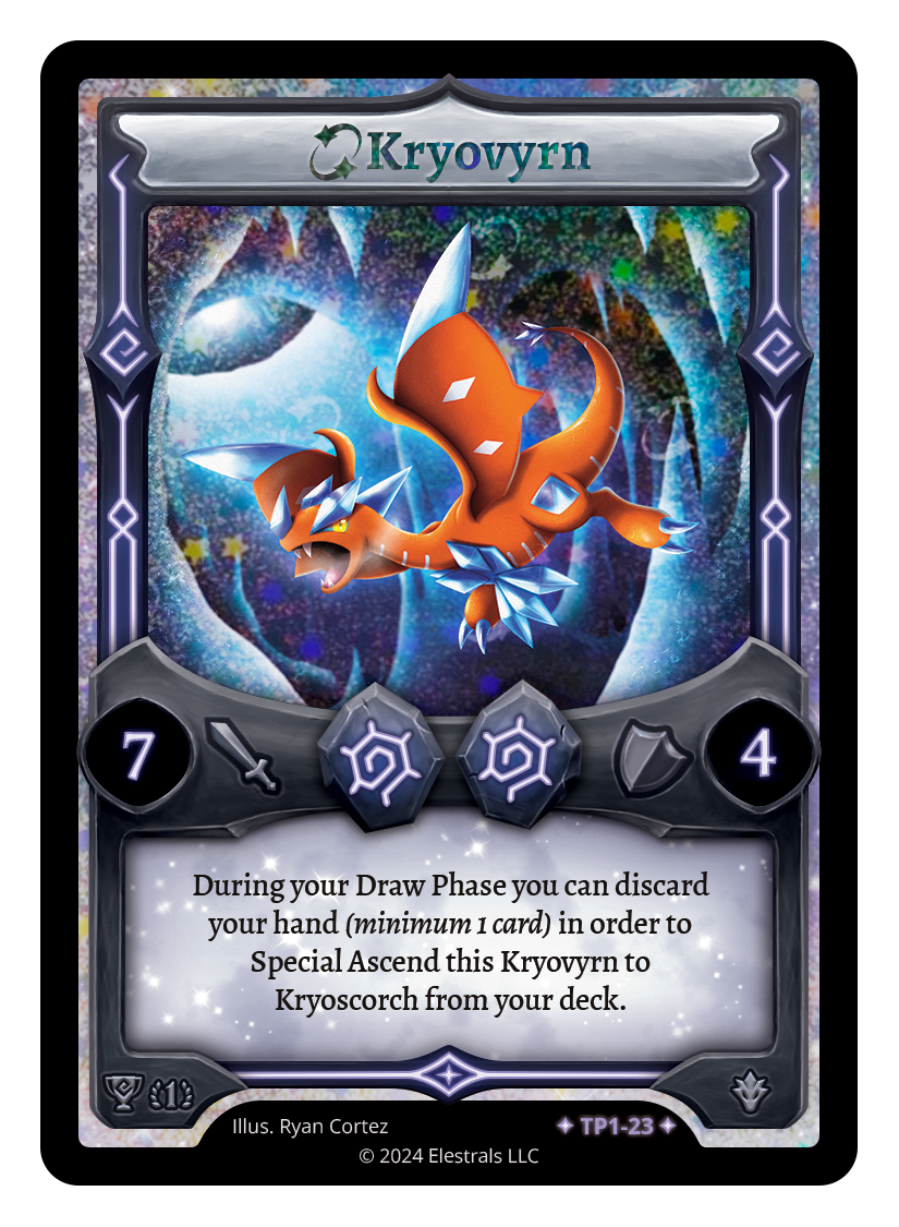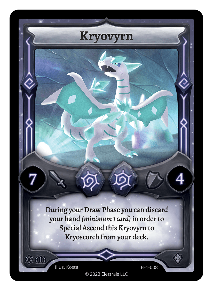 Kryovyrn❮❯❮❯❮❯SD06-02FF1-008TP1-23TypeElestralCostFrostFrostElementsFrostAttack7Defense4Card TextDuring your Draw Phase you can discard your hand in order to Special Ascend this Kryovyrn to Kryoscorch from your deck.SubclassesDragon
