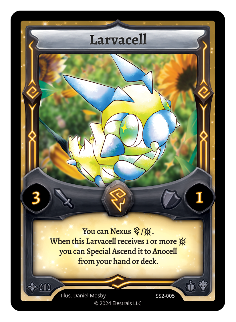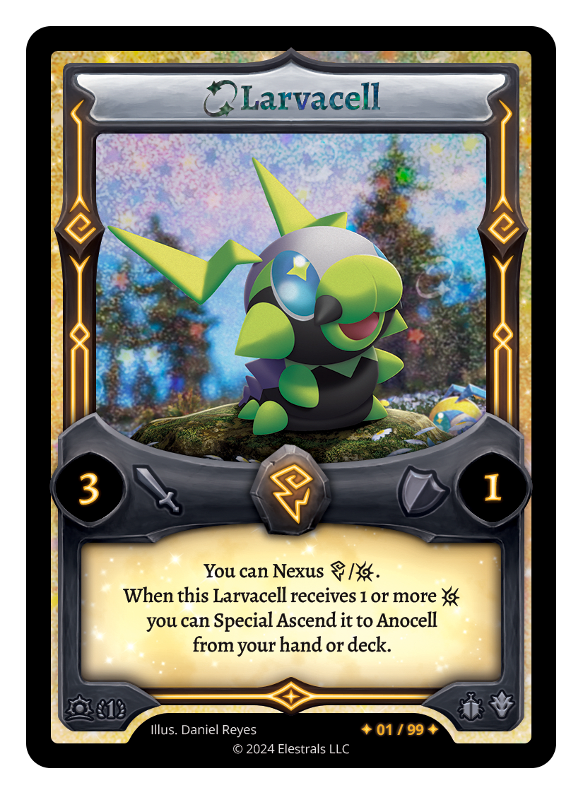 Larvacell❮❯❮❯❮❯XX/99DB1-052SS2-005TypeElestralCostThunderElementsThunderAttack3Defense1Card TextYou can Nexus {T}/{L}. When this Larvacell receives 1 or more {L} you can Special Ascend it to Anocell from your hand or deck.SubclassesInsectoidDragon