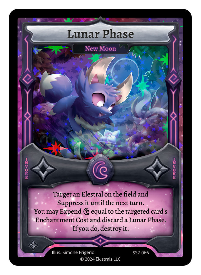 Target an Elestral on the field and Suppress it until the next turn. You may Expend {D} equal to the targeted Elestral’s Enchantment Cost and discard a Lunar Phase. If you do, destroy it.