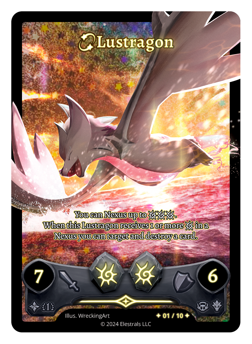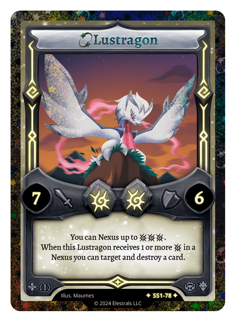 Lustragon❮❯❮❯❮❯❮❯DB1-082DB1-010SS1-78XX/10TypeElestralCostSolarSolarElementsSolarAttack7Defense6Card TextYou can Nexus up to {LLL}. When this Lustragon receives 1 or more {L} in a Nexus you can target and destroy a card.SubclassesEtherealDragon