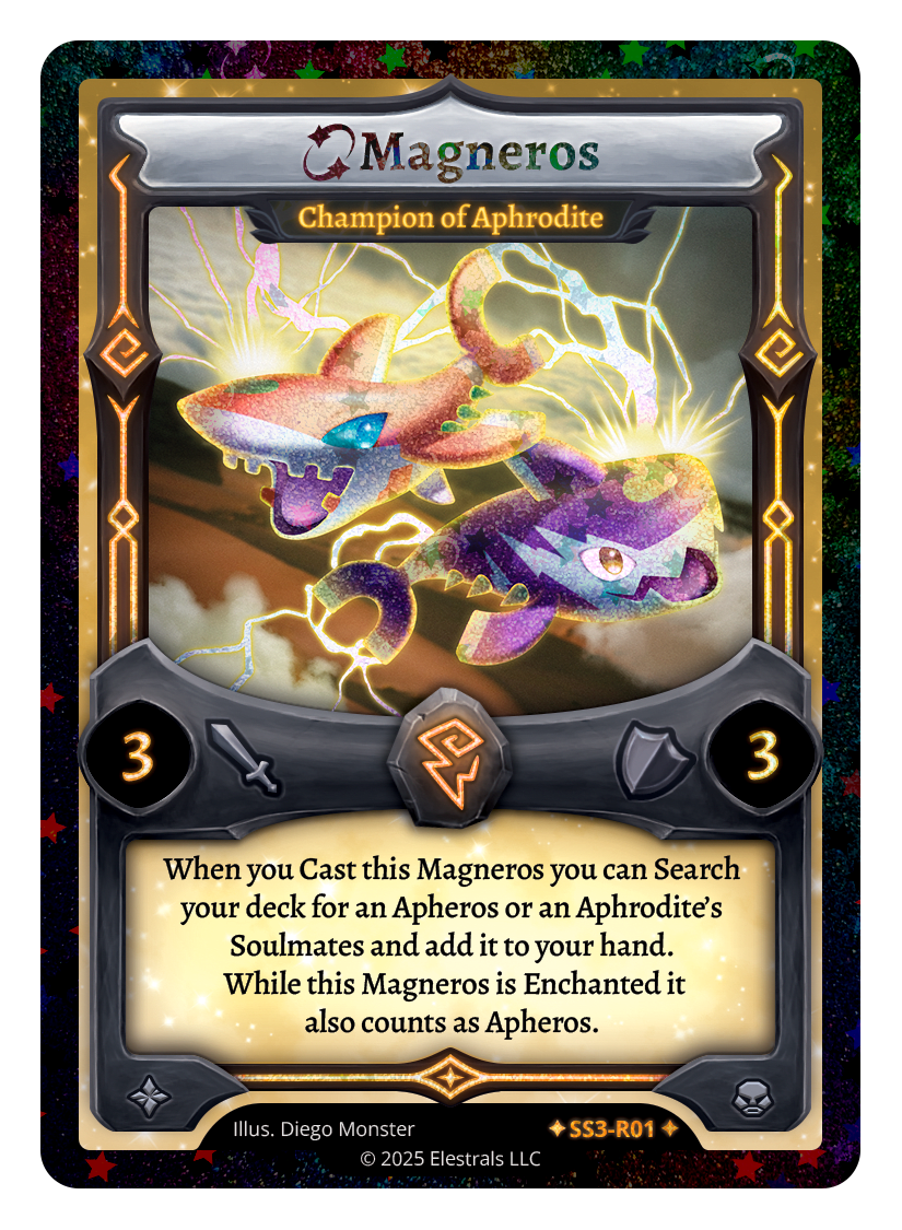 When you Cast this Magneros you can Search your deck for an Apheros or an Aphrodite's Soulmates and add it to your hand. While this Magneros is Enchanted it also counts as Apheros.