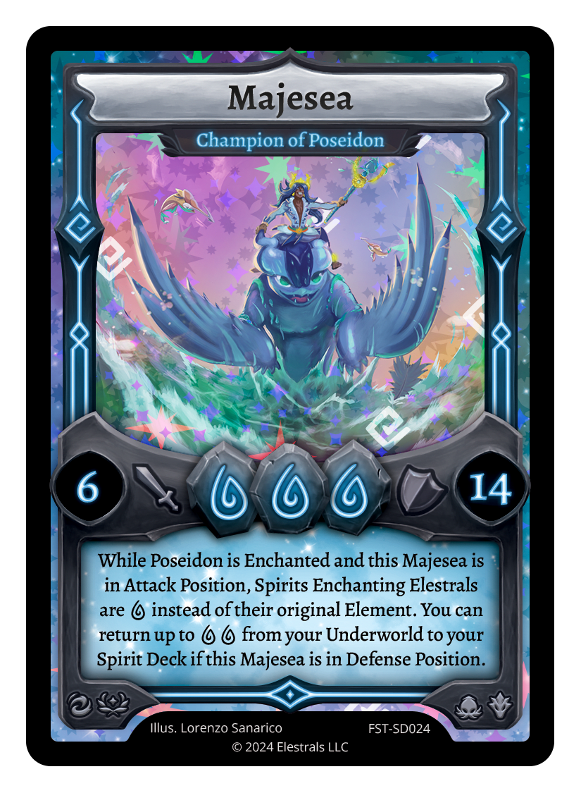 While Poseidon is Enchanted and this Majesea is in Attack Position, Spirits Enchanting Elestrals are {W} instead of their original Element. You can return up to {WW} from your Underworld to your Spirit Deck if this Majesea is in Defense Position.