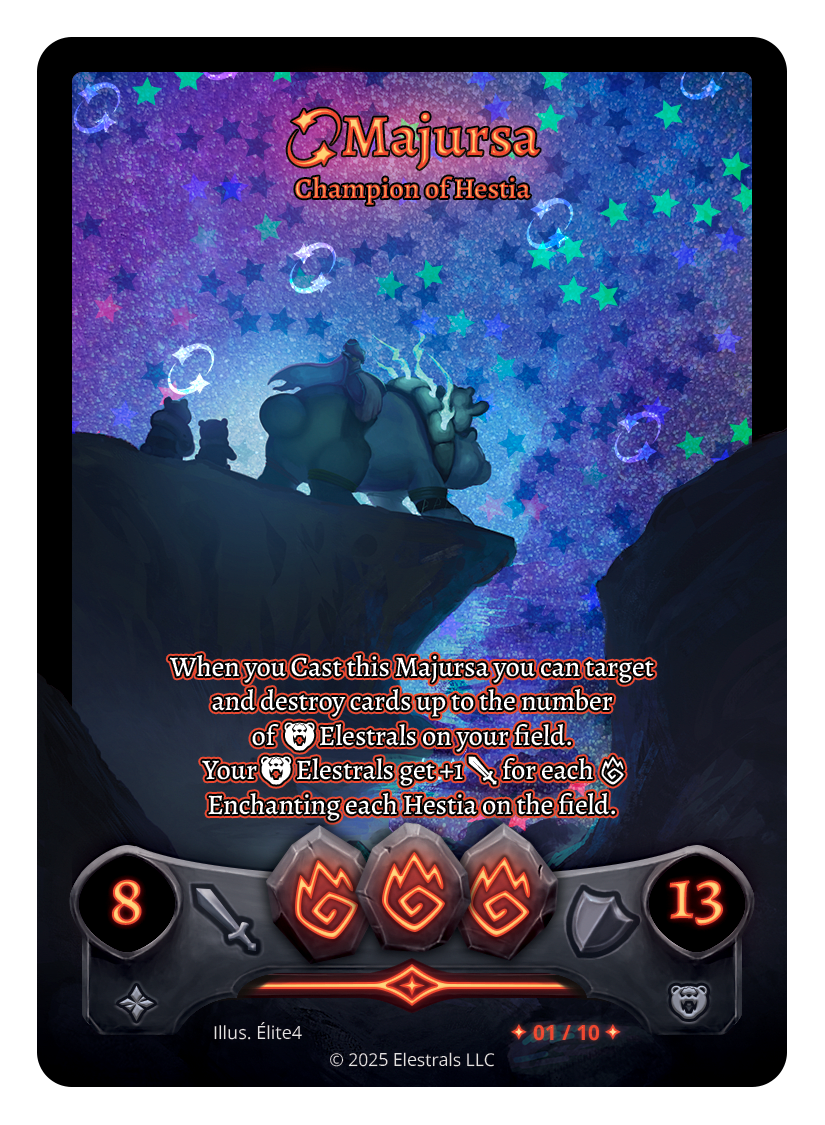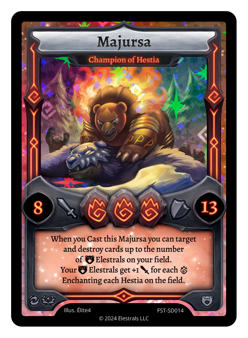 When you Cast this Majursa you can target and destroy cards up to the number of {B} Elestrals on your field. Your {B} Elestrals get +1 {J} for each {F} Enchanting each Hestia on the field.