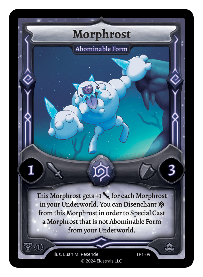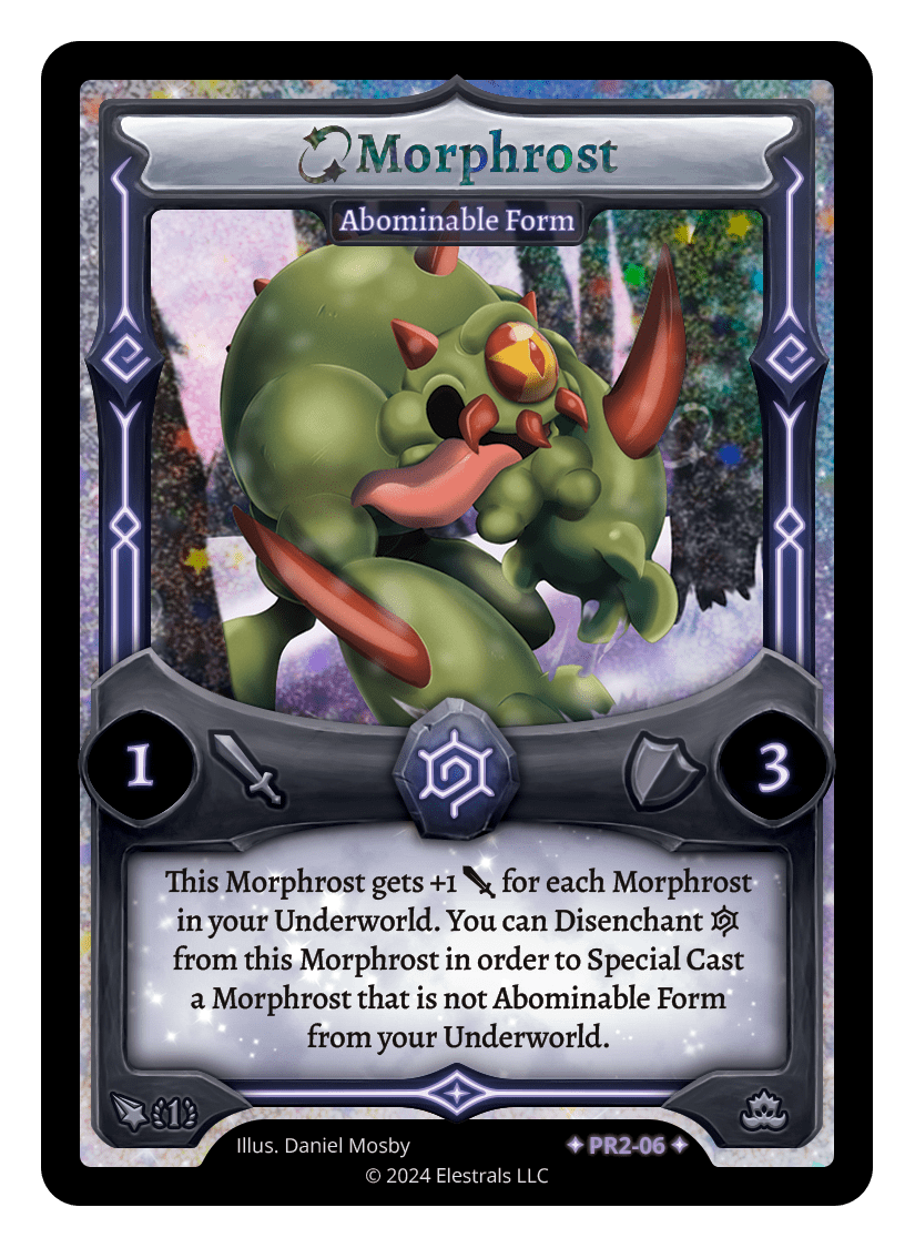 This Morphrost gets +1 {J} for each Morphrost in your Underworld. You can Disenchant {I} from this Morphrost in order to Special Cast a Morphrost that is not Abominable Form from your Underworld.