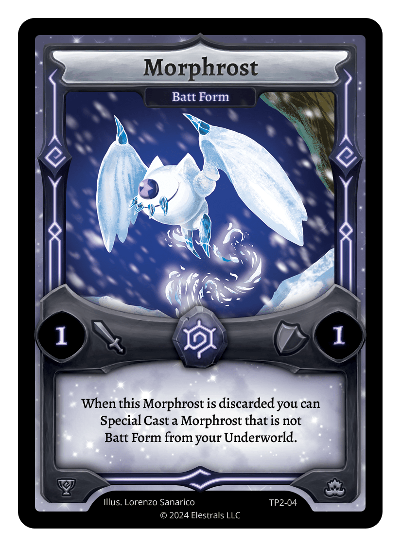 Morphrost - Batt Form❮❯❮❯❮❯XX/99DB1-064TP2-04TypeElestralCostFrostElementsFrostAttack1Defense1Card TextWhen this Morphrost is discarded you can Special Cast a Morphrost that is not Batt Form from your Underworld.SubclassesBehemoth