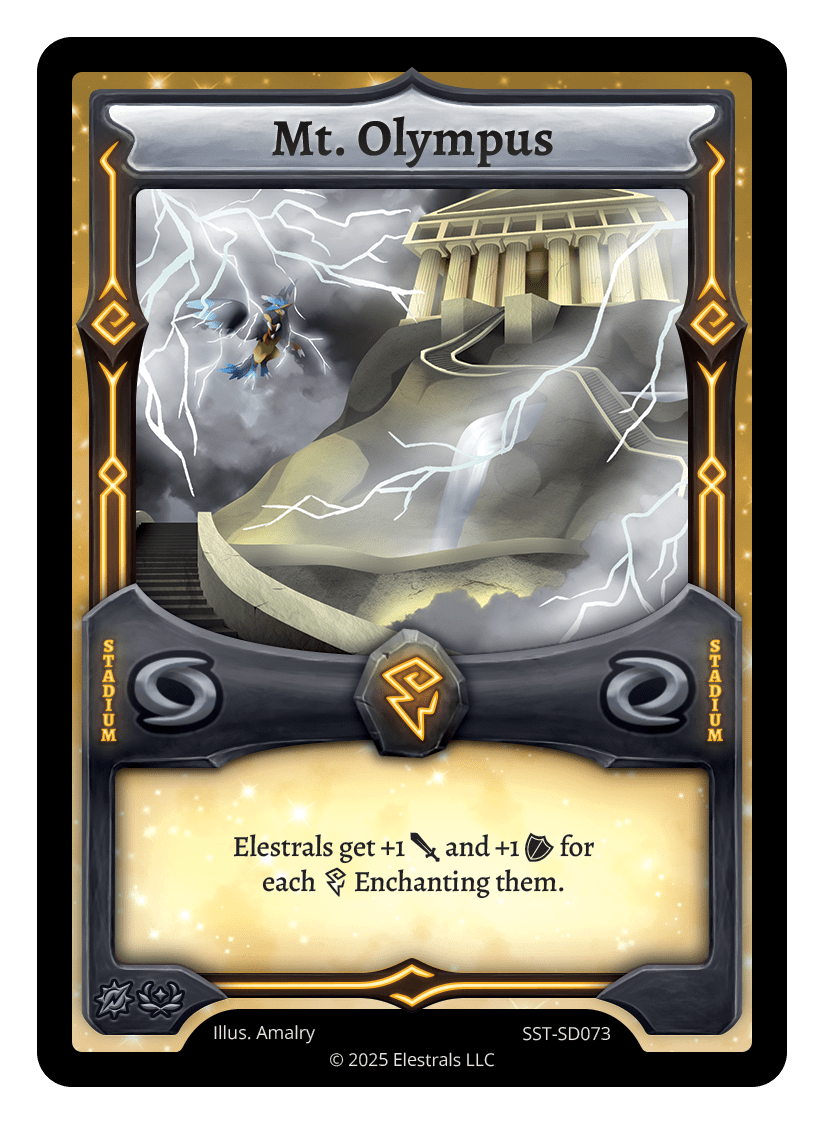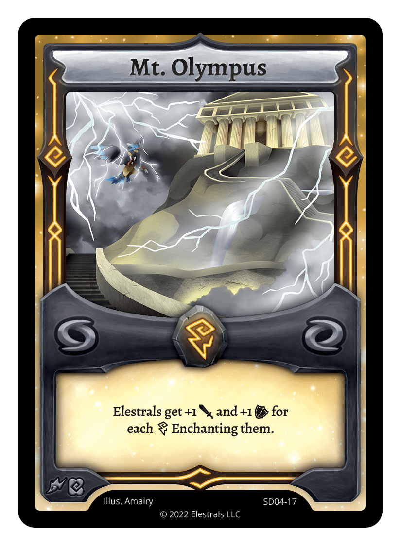 Mt. Olympus❮❯❮❯❮❯❮❯❮❯❮❯❮❯❮❯BS1-096BS1-096SD04-17SD04-17FF1-089SS2-010FST-SD082SST-SD073TypeRuneStadiumCostThunderElementsThunderCard TextElestrals get +1 {J} and +1 {O} for each {T} Enchanting them.