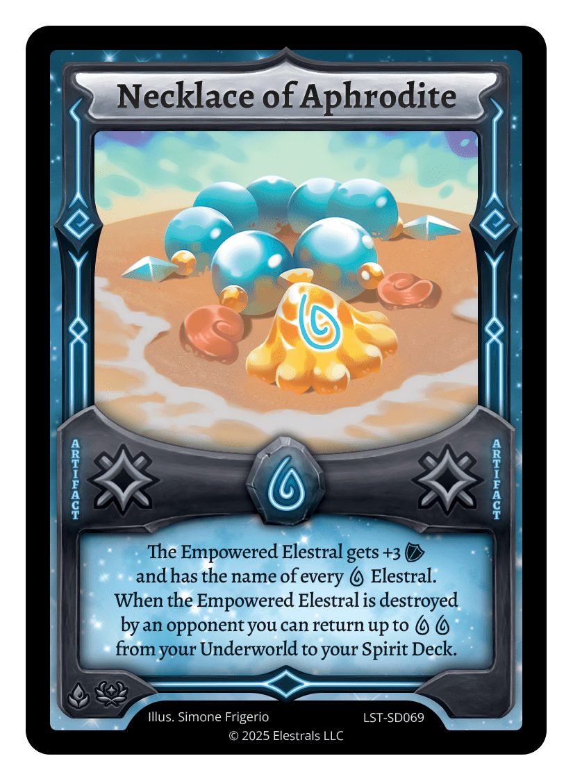 The Empowered Elestral gets +3 {O} and has the name of every {W} Elestral. When the Empowered Elestral is destroyed by an opponent you can return up to {WW} from your Underworld to your Spirit Deck.