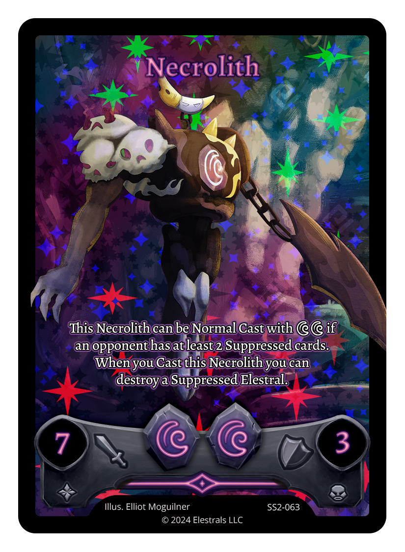 This Necrolith can be Normal Cast with {DD} if an opponent has at least 2 Suppressed cards. When you Cast this Necrolith you can destroy a Suppressed Elestral.