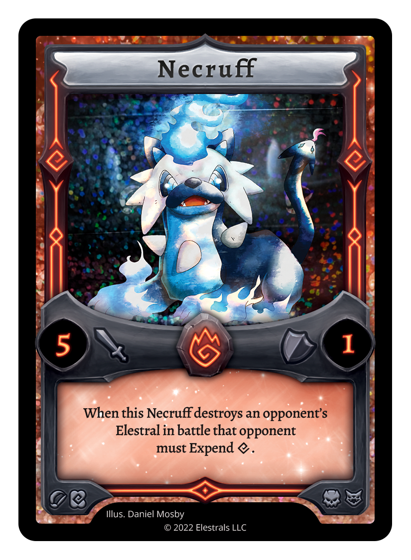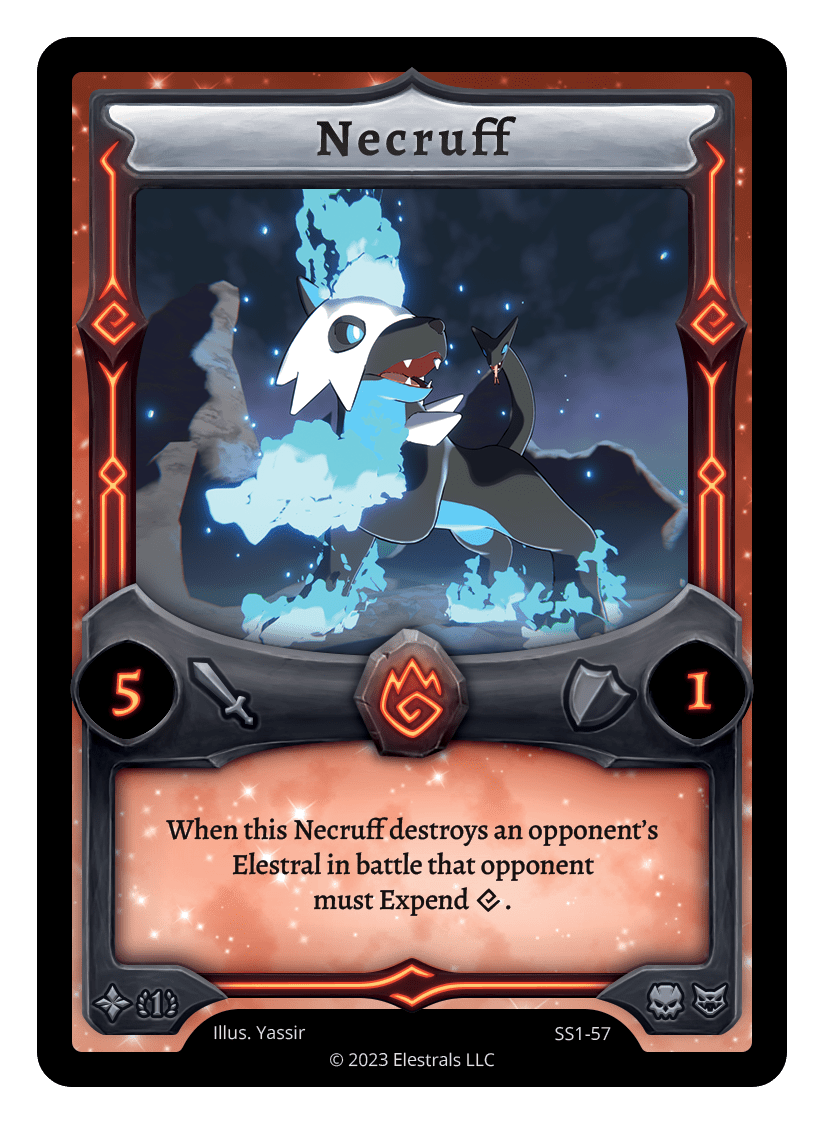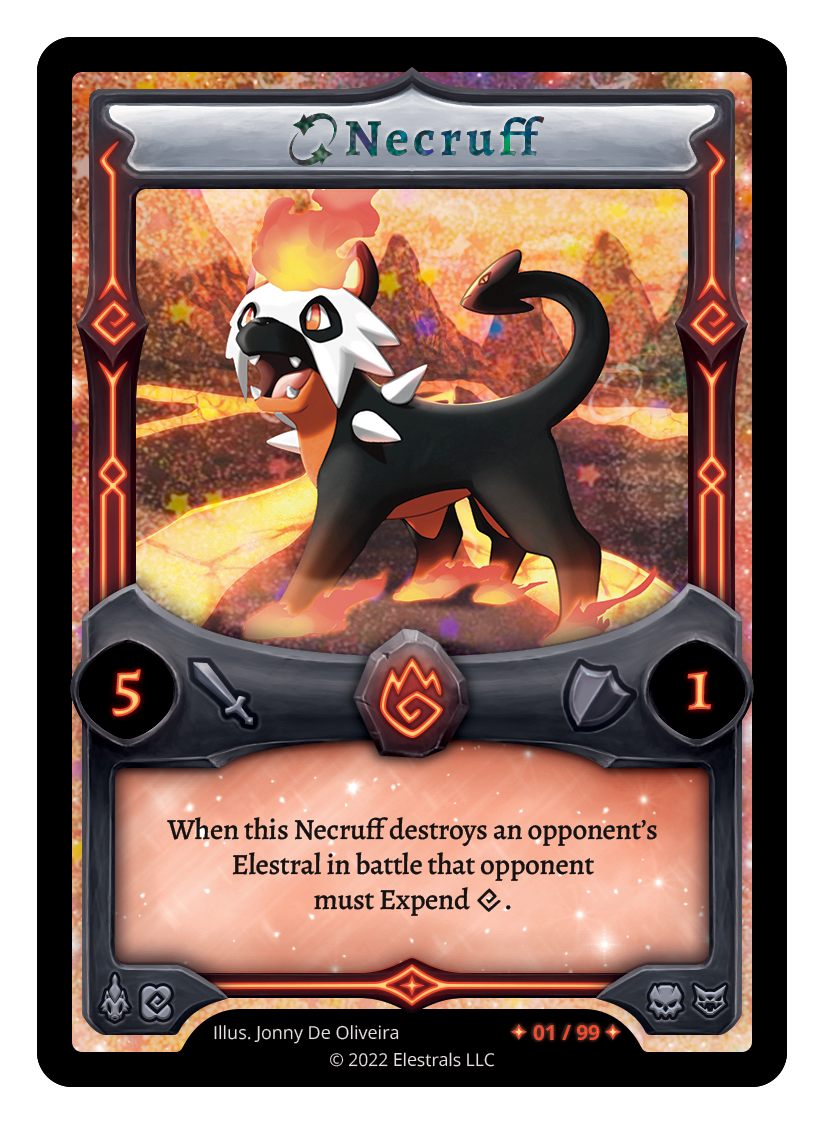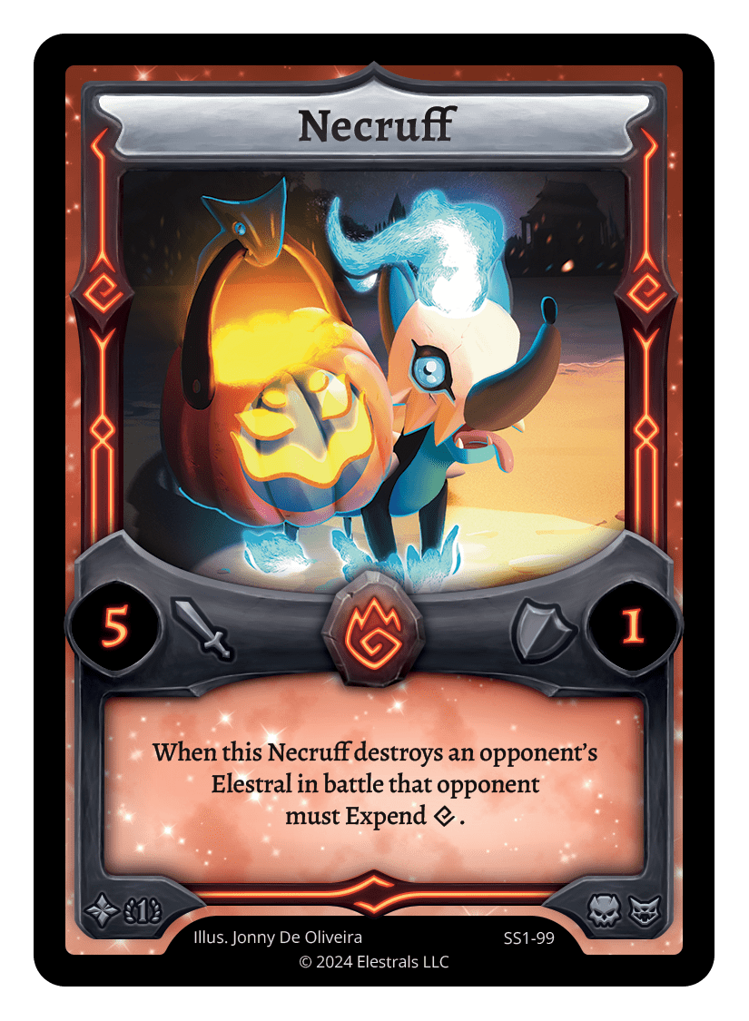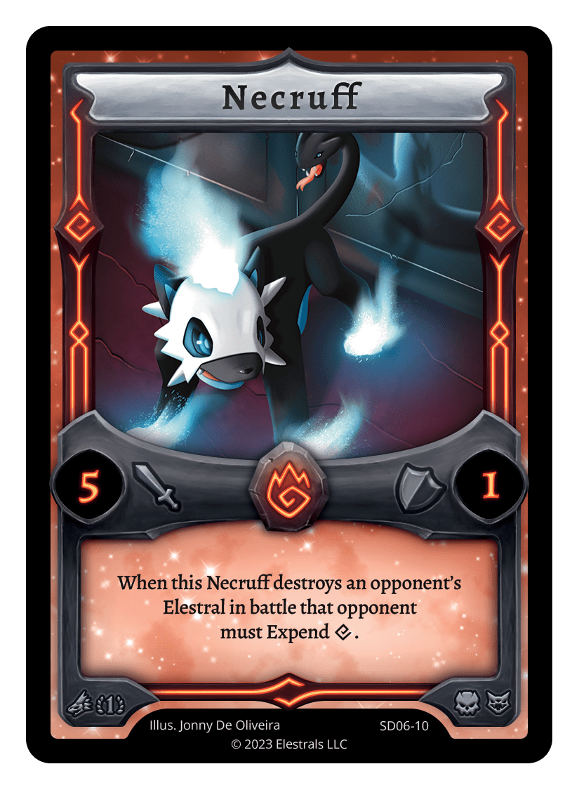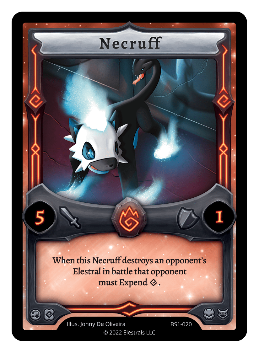 Necruff❮❯❮❯❮❯❮❯❮❯❮❯❮❯❮❯❮❯BS1-020SD02-01XX/99SD02-01AC1-17SS1-57SD06-10BS1-020SS1-99TypeElestralCostFireElementsFireAttack5Defense1Card TextWhen this Necruff destroys an opponent's Elestral in battle that opponent must Expend {X}.SubclassesEldritchBrute