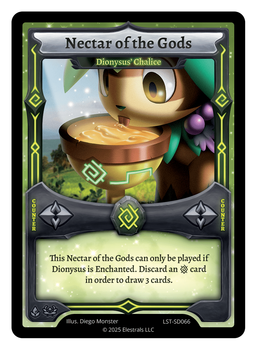 Nectar of the Gods - Dionysus' Chalice❮❯❮❯❮❯LST-088LST-SD066SS2-195TypeRuneCounterCostEarthElementsEarthCard TextThis Nectar of the Gods can only be played if Dionysus is Enchanted. Discard an {E} card in order to draw 3 cards.
