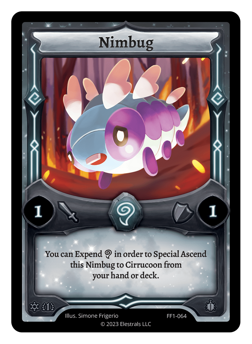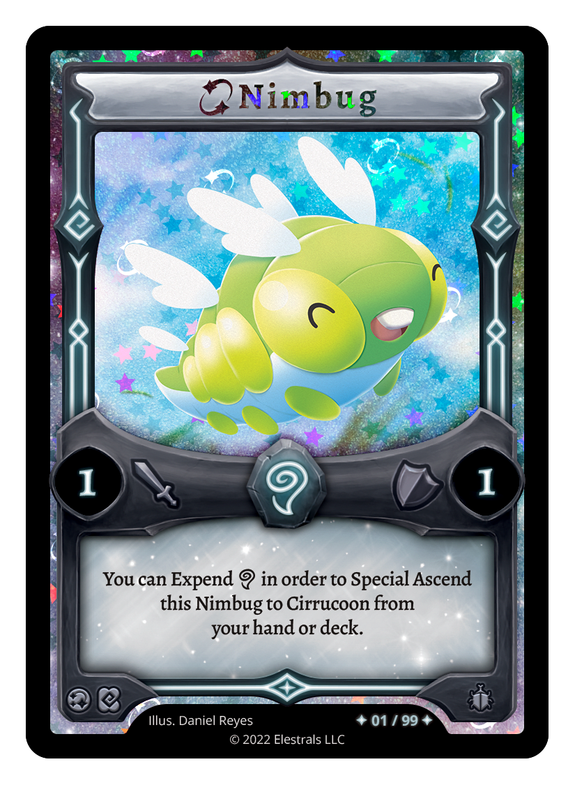 Nimbug❮❯❮❯❮❯❮❯❮❯BS1-071XX/99BS1-071FF1-064SS2-185TypeElestralCostWindElementsWindAttack1Defense1Card TextYou can Expend {A} in order to Special Ascend this Nimbug to Cirrucoon from your hand or deck.SubclassesInsectoid