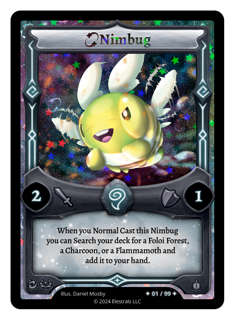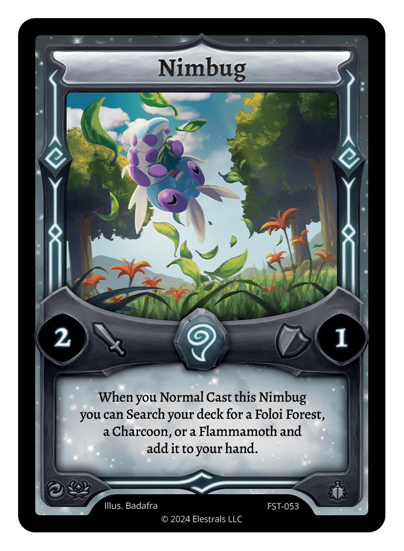 Nimbug (FST)❮❯❮❯XX/99FST-053TypeElestralCostWindElementsWindAttack2Defense1Card TextWhen you Normal Cast this Nimbug you can Search your deck for a Foloi Forest, a Charcoon, or a Flammamoth and add it to your hand.SubclassesInsectoid
