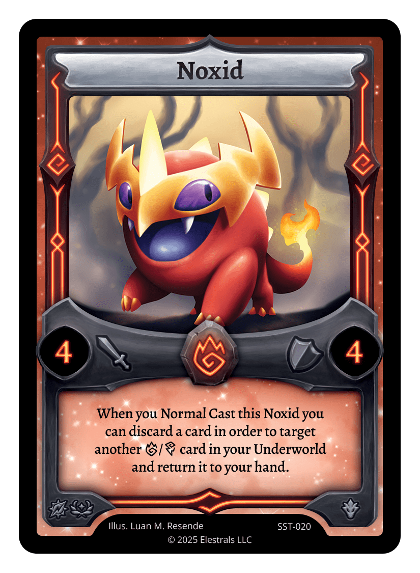 Noxid❮❯SST-020TypeElestralCostFireElementsFireAttack4Defense4Card TextWhen you Normal Cast this Noxid you can discard a card in order to target another {F}/{T} card in your Underworld and return it to your hand.SubclassesDragon