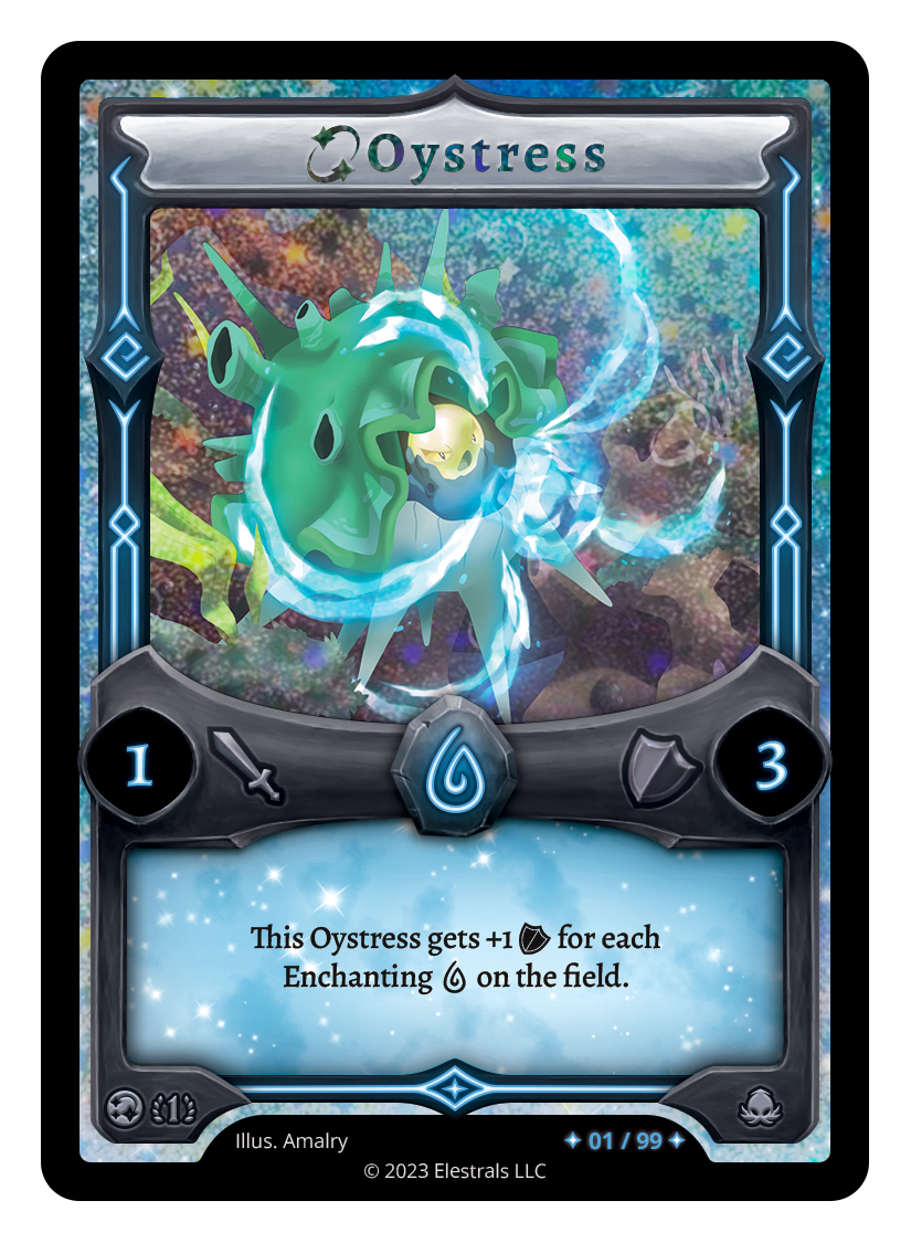 Oystress❮❯❮❯❮❯❮❯❮❯XX/99SD03-08SD03-08SS2-028MR1-050TypeElestralCostWaterElementsWaterAttack1Defense3Card TextThis Oystress gets +1 {O} for each Enchanting {W} on the field.SubclassesOceanic