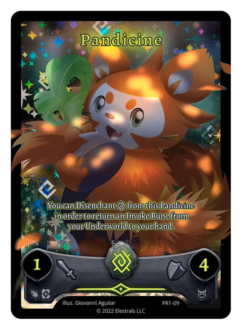 Pandicine❮❯❮❯❮❯❮❯PR1-06BS1-019BS1-019PR1-09TypeElestralCostEarthElementsEarthAttack1Defense4Card TextYou can Disenchant {E} from this Pandicine in order to return an Invoke Rune from your Underworld to your hand.SubclassesBrute