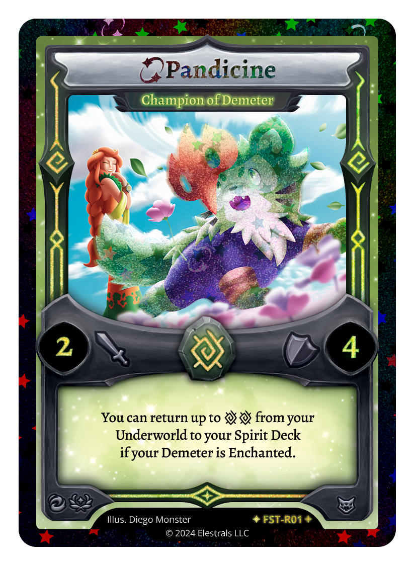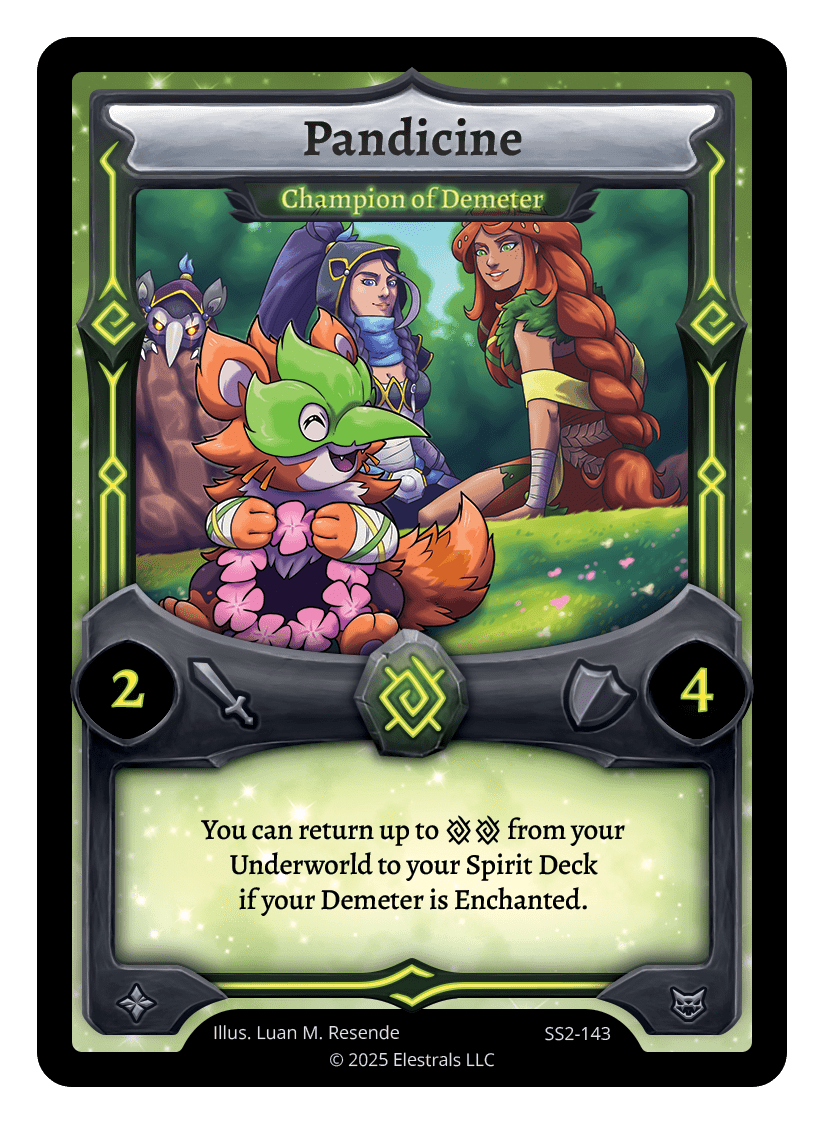 Pandicine - Champion of Demeter❮❯❮❯❮❯FST-009FST-R01SS2-143TypeElestralCostEarthElementsEarthAttack2Defense4Card TextYou can return up to {EE} from your Underworld to your Spirit Deck if your Demeter is Enchanted.SubclassesBrute