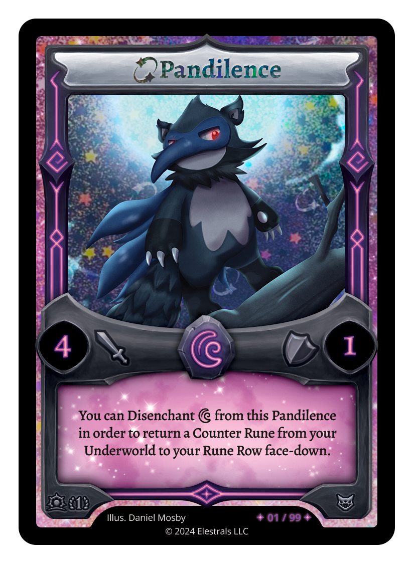 Pandilence❮❯❮❯❮❯DB1-033SD09-12XX/99TypeElestralCostLunarElementsLunarAttack4Defense1Card TextYou can Disenchant {D} from this Pandilence in order to return a Counter Rune from your Underworld to your Rune Row face-down.SubclassesBrute