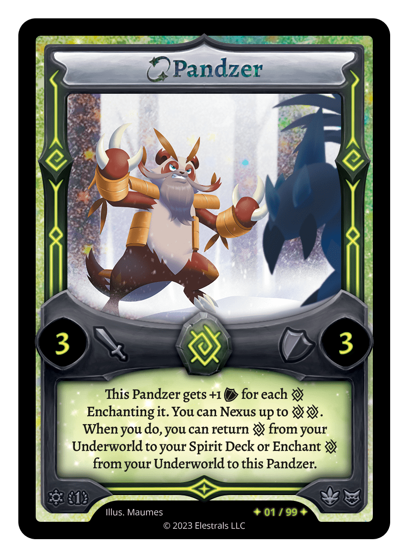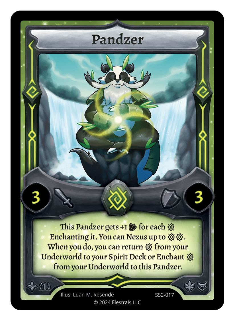 This Pandzer gets +1 {O} for each {E} Enchanting it. You can Nexus up to {EE}. When you do, you can return {E} from your Underworld to your Spirit Deck or Enchant {E} from your Underworld to this Pandzer.