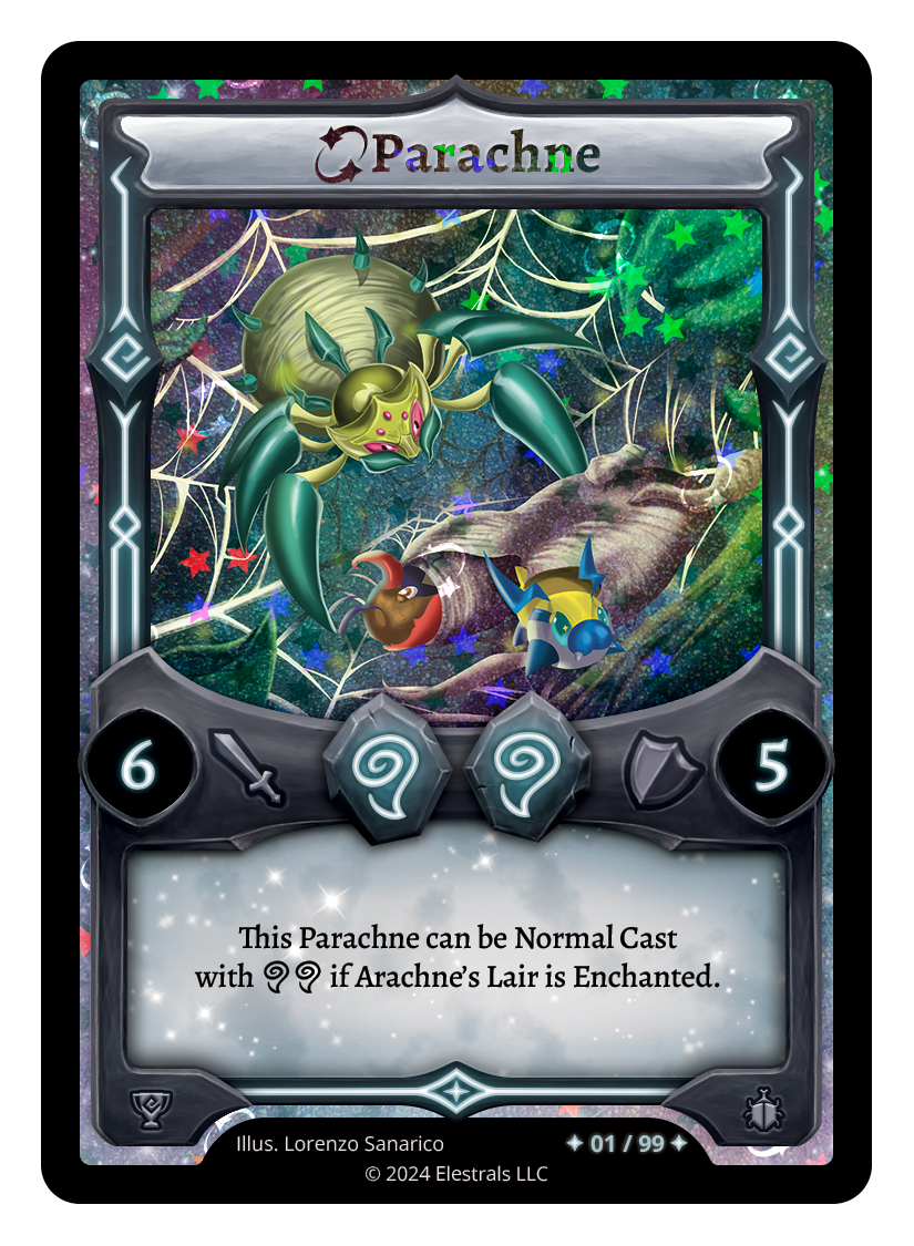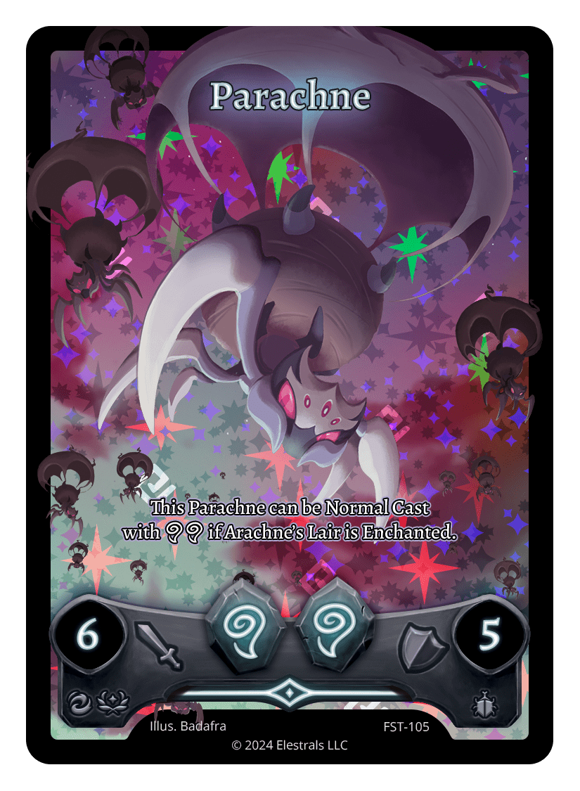 Parachne❮❯❮❯❮❯FST-105FST-057XX/99TypeElestralCostWindWindElementsWindAttack6Defense5Card TextThis Parachne can be Normal Cast with {AA} if Arachne's Lair is Enchanted.SubclassesInsectoid