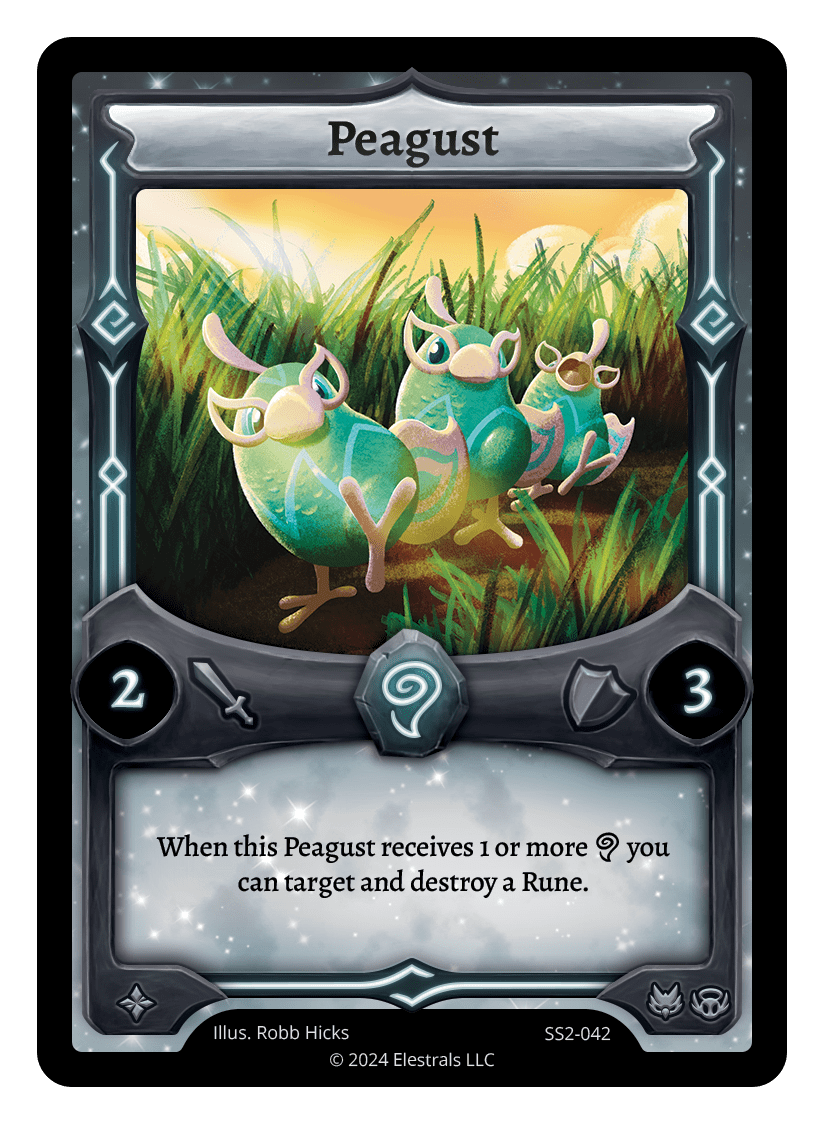 Peagust❮❯❮❯❮❯❮❯❮❯❮❯❮❯❮❯❮❯SD01-10SD05-06SD07-12SD05-06BS1-074SD01-10XX/99BS1-074SS2-042TypeElestralCostWindElementsWindAttack2Defense3Card TextWhen this Peagust receives 1 or more {A} you can target and destroy a Rune.SubclassesAvianEthereal