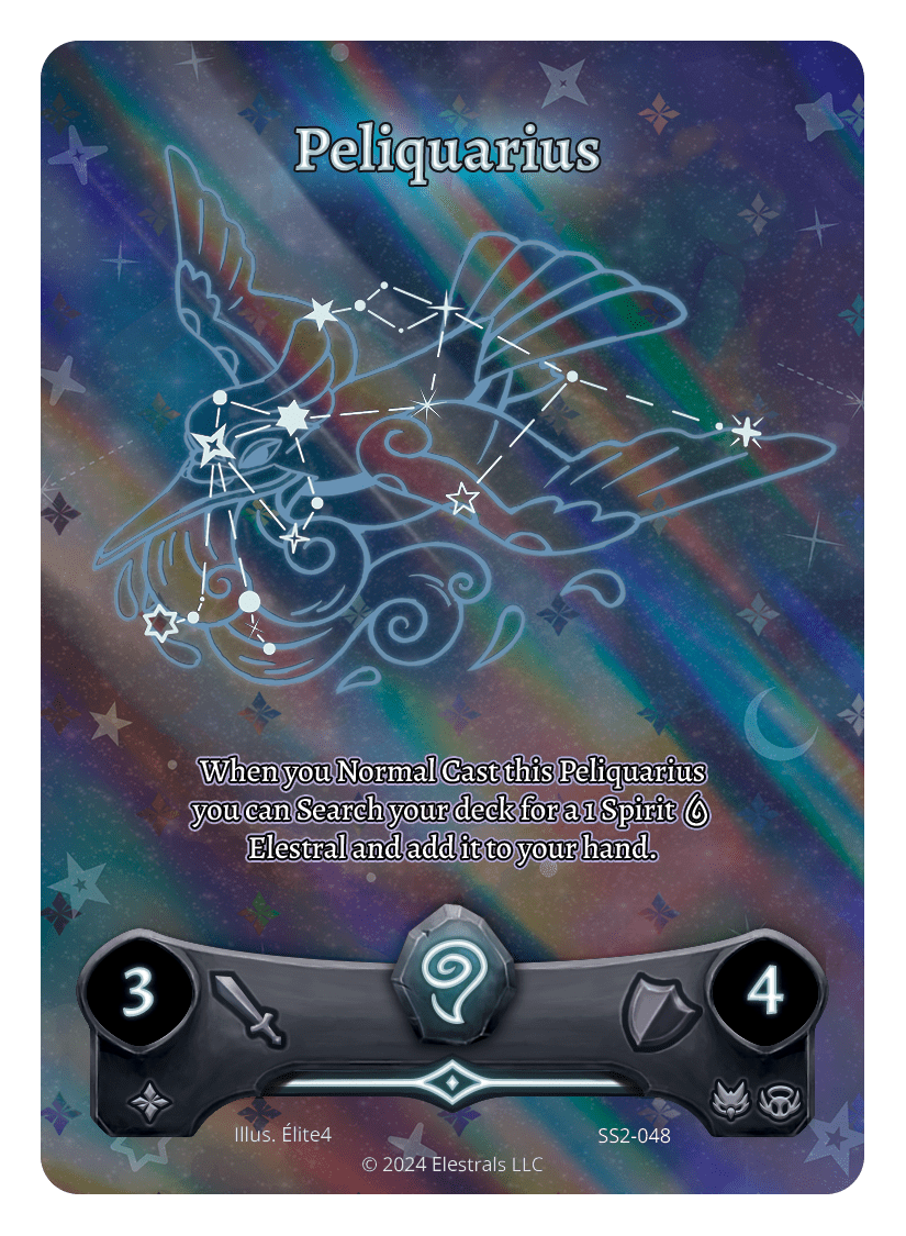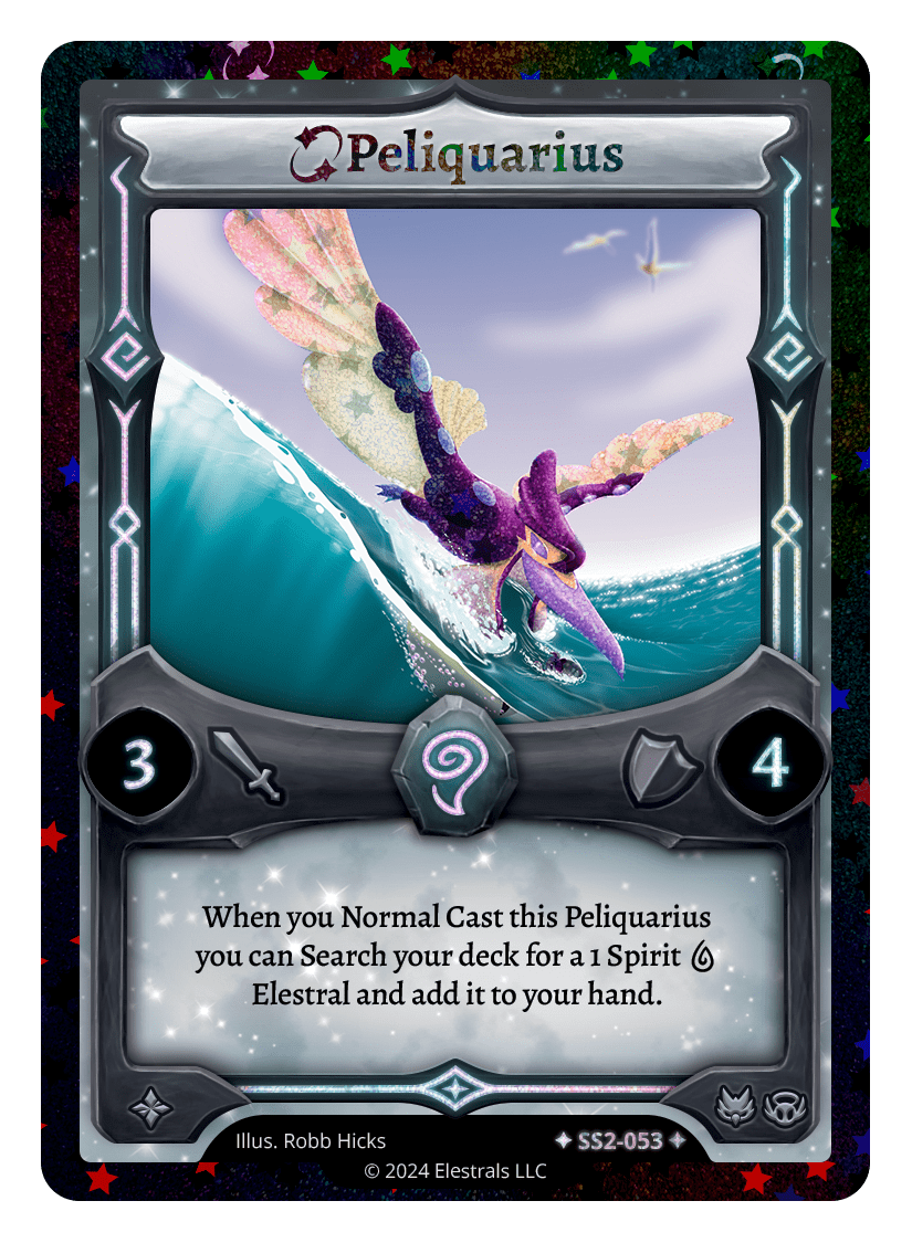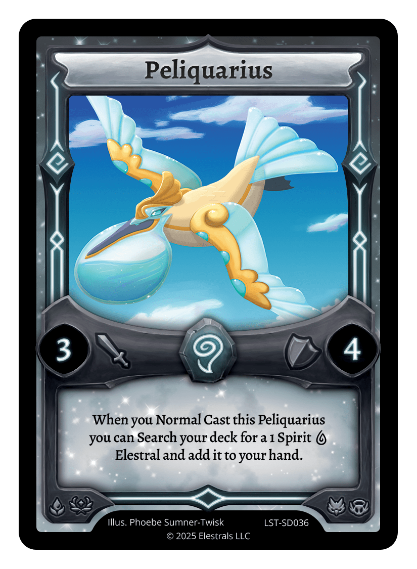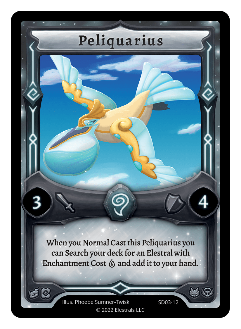 Peliquarius❮❯❮❯❮❯❮❯❮❯❮❯❮❯❮❯BS1-079SD03-12SS1-17BS1-079SD03-12SS2-048SS2-053LST-SD036TypeElestralCostWindElementsWindAttack3Defense4Card TextWhen you Normal Cast this Peliquarius you can Search your deck for a 1 Spirit {W} Elestral and add it to your hand.SubclassesAvianEthereal