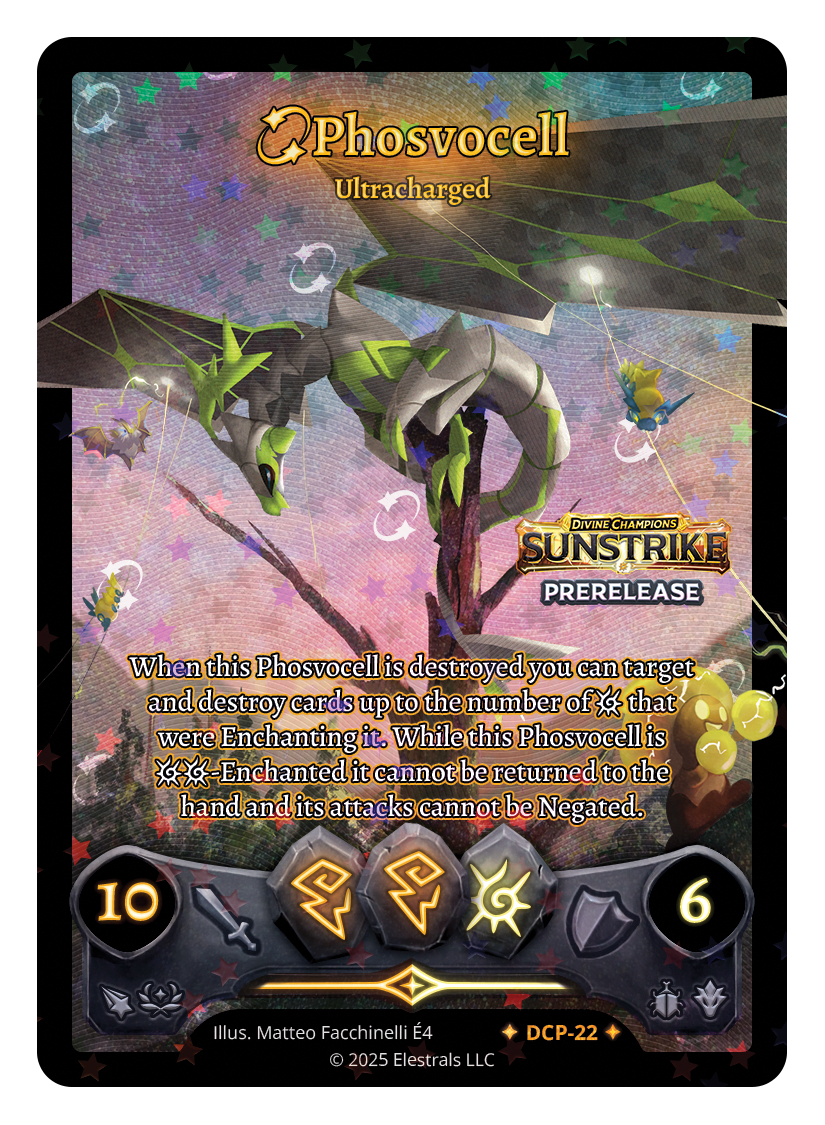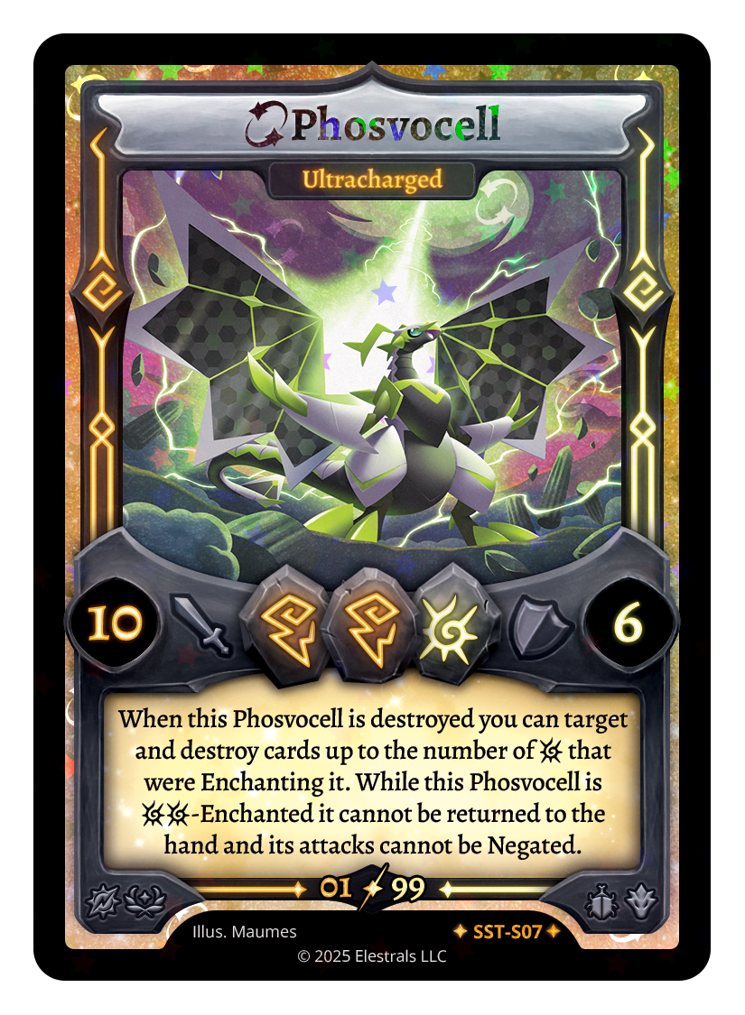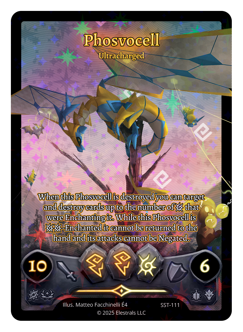 When this Phosvocell is destroyed you can target and destroy cards up to the number of {L} that were Enchanting it. While this Phosvocell is {LL}-Enchanted it cannot be returned to the hand and its attacks cannot be Negated.