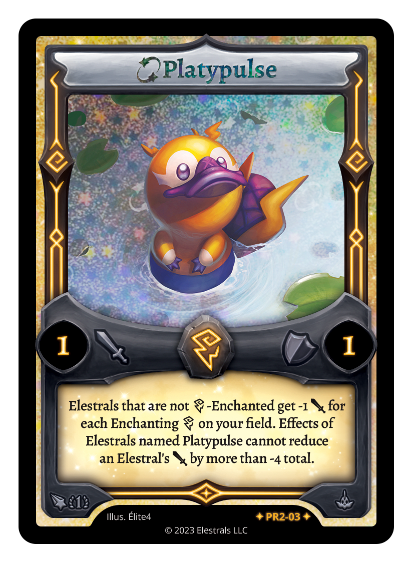 Elestrals that are not {T}-Enchanted get -1 {J} for each Enchanting {T} on your field. Effects of Elestrals named Platypulse cannot reduce an Elestral's {J} by more than -4 total.
