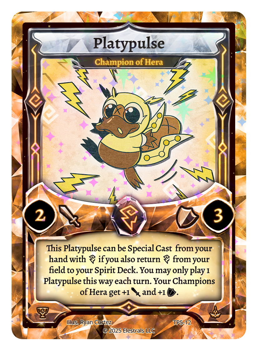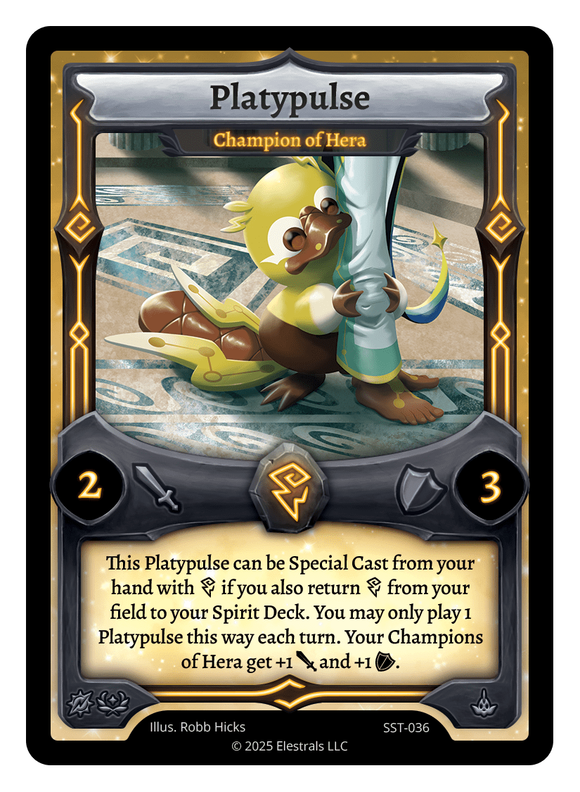 This Platypulse can be Special Cast from your hand with {T} if you also return {T} from your field to your Spirit Deck. You may only play 1 Platypulse this way each turn. Your Champions of Hera get +1 {J} and +1 {O}.