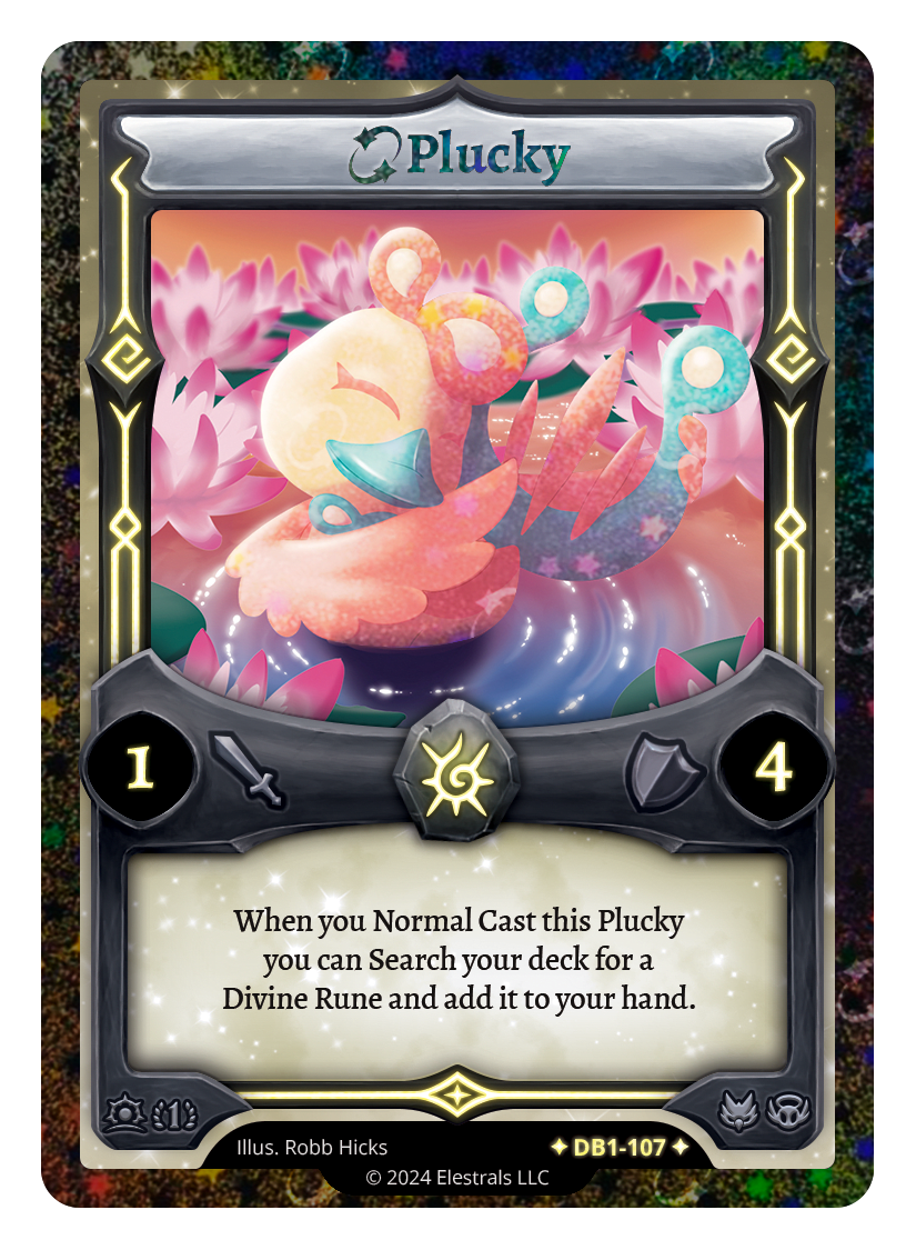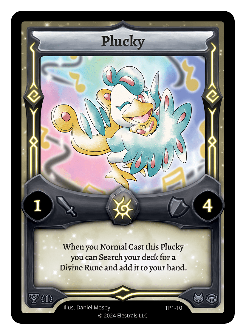 Plucky❮❯❮❯❮❯❮❯❮❯❮❯SD08-04SD09-10DB1-029DB1-107TP1-10FST-SD062TypeElestralCostSolarElementsSolarAttack1Defense4Card TextWhen you Normal Cast this Plucky you can Search your deck for a Divine Rune and add it to your hand.SubclassesAvianEthereal
