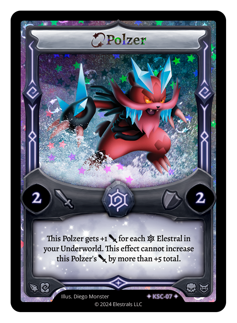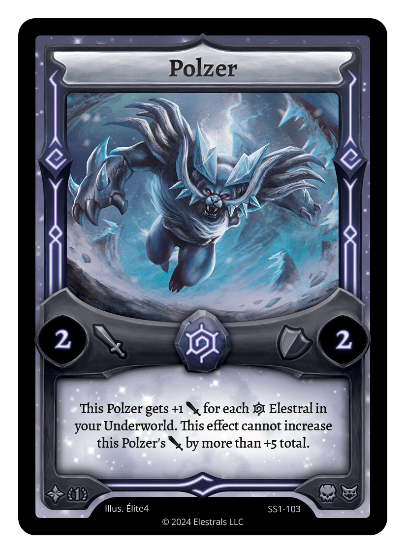 Polzer❮❯❮❯❮❯DB1-065SS1-103KSC-07TypeElestralCostFrostElementsFrostAttack2Defense2Card TextThis Polzer gets +1 {J} for each {I} Elestral in your Underworld. This effect cannot increase this Polzer's {J} by more than +5 total.SubclassesEldritchBrute