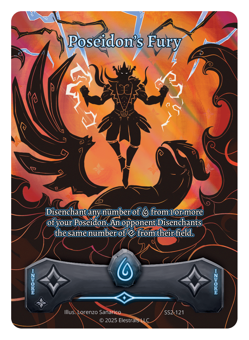Poseidon's Fury❮❯❮❯❮❯❮❯FST-083FST-R10FST-SD073SS2-121TypeRuneInvokeCostWaterElementsWaterCard TextDisenchant any number of {W} from 1 or more of your Poseidon. An opponent Disenchants the same number of {X} from their field.