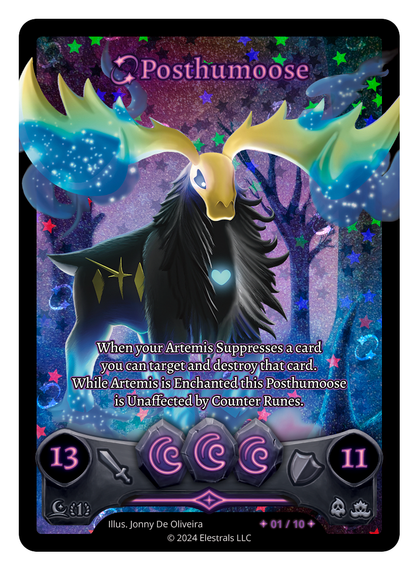 When your Artemis Suppresses a card you can target and destroy that card. While Artemis is Enchanted this Posthumoose is Unaffected by Counter Runes.