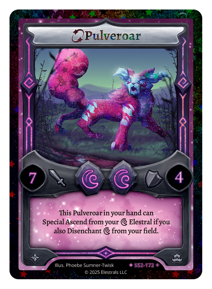 Pulveroar❮❯❮❯❮❯MR1-027SD10-06SS2-172TypeElestralCostLunarLunarElementsLunarAttack7Defense4Card TextThis Pulveroar in your hand can Special Ascend from your {D} Elestral if you also Disenchant {D} from your field.SubclassesBehemoth