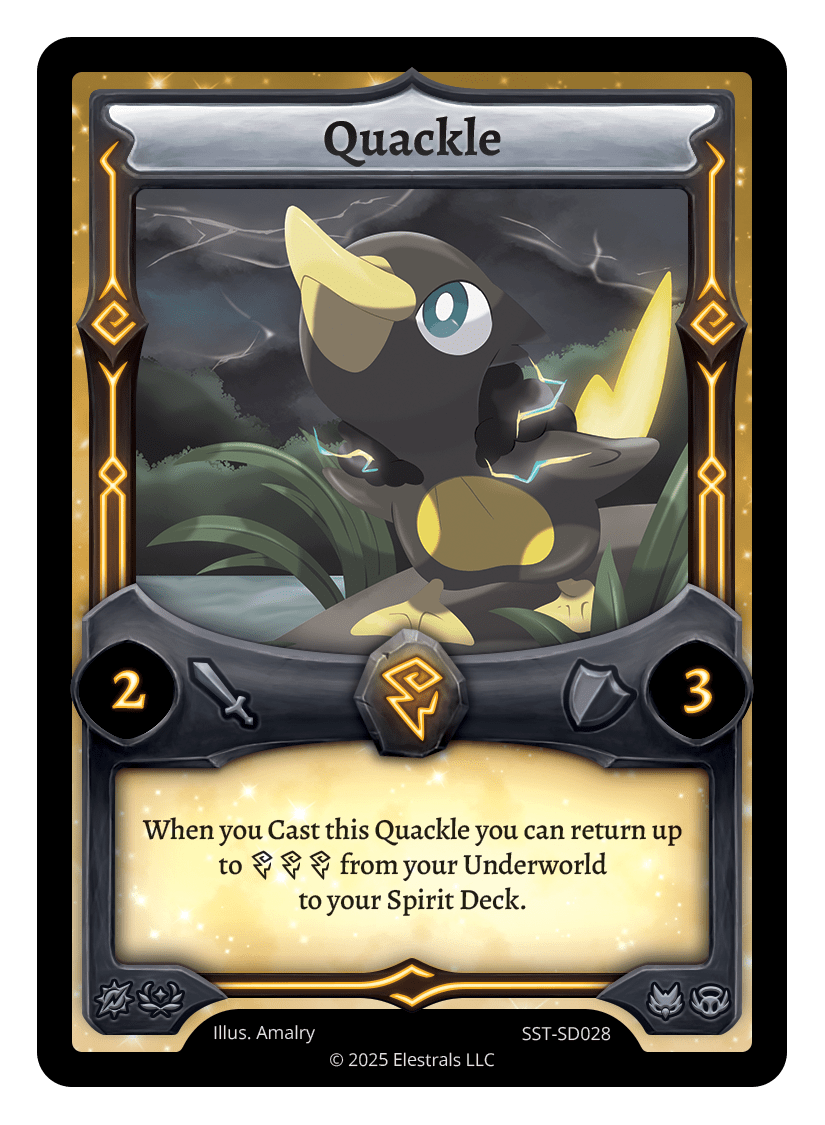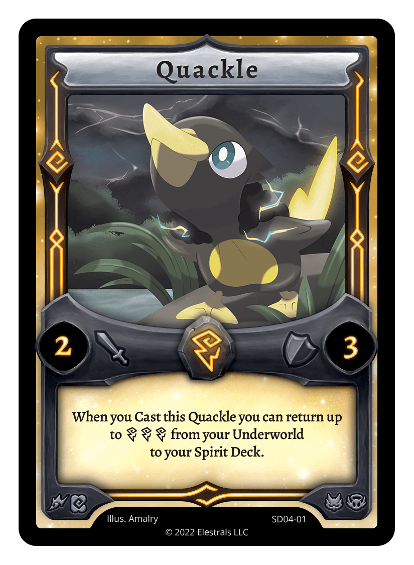 Quackle❮❯❮❯❮❯❮❯❮❯❮❯❮❯❮❯❮❯SS1-05XX/99BS1-063SD04-01AC1-19SD04-01AC1-13BS1-063SST-SD028TypeElestralCostThunderElementsThunderAttack2Defense3Card TextWhen you Cast this Quackle you can return up to {TTT} from your Underworld to your Spirit Deck.SubclassesAvianEthereal