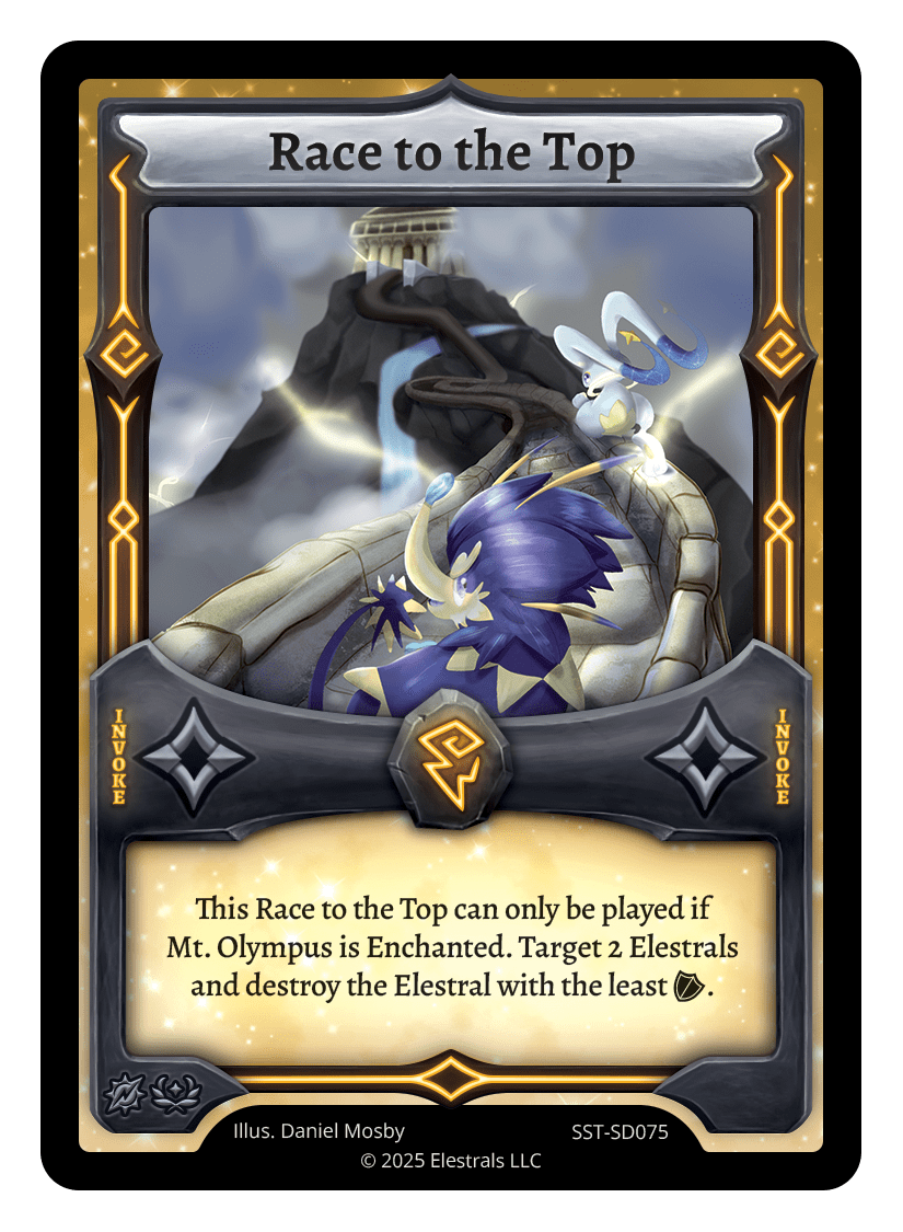 Race to the Top❮❯❮❯❮❯❮❯FF1-079SS2-012FST-SD083SST-SD075TypeRuneInvokeCostThunderElementsThunderCard TextThis Race to the Top can only be played if Mt. Olympus is Enchanted. Target 2 Elestrals and destroy the Elestral with the least {O}.