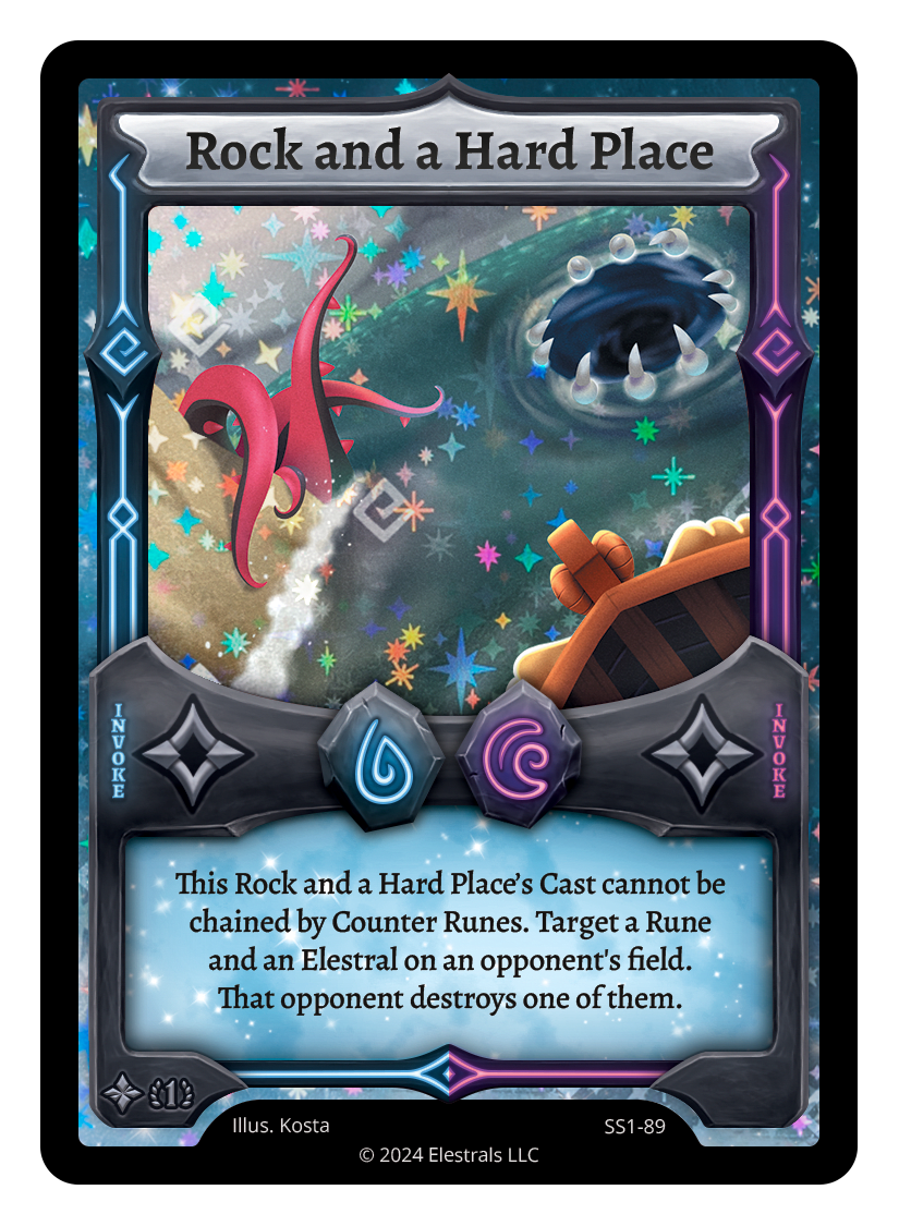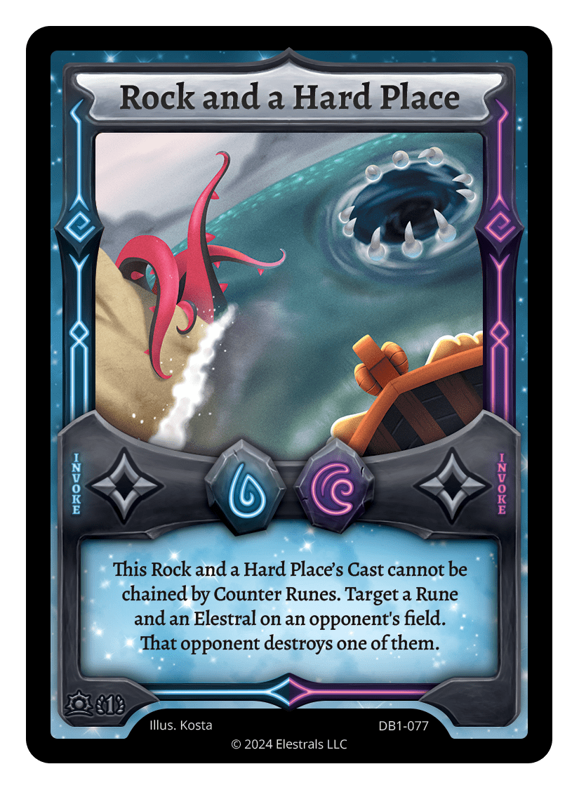 While this Rock and a Hard Place is on a Chain, players cannot play Counter Runes. Target a Rune and an Elestral on an opponent's field. That opponent destroys one of them.
