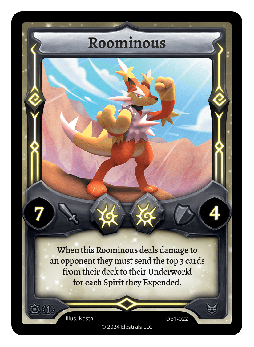 Roominous❮❯❮❯DB1-022KSC-18TypeElestralCostSolarSolarElementsSolarAttack7Defense4Card TextWhen this Roominous deals damage to an opponent they must send the top 3 cards from their deck to the Underworld for each Spirit they Expended.SubclassesBrute