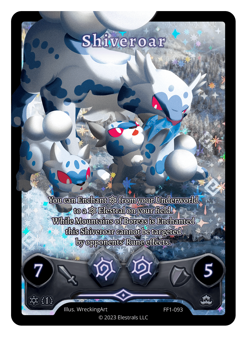 You can Enchant {I} from your Underworld to a {I} Elestral on your field. While Mountains of Boreas is Enchanted this Shiveroar cannot be targeted by opponents' Rune effects.