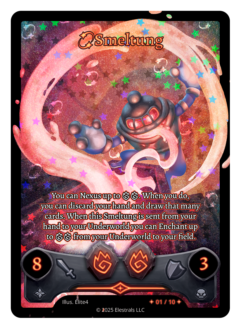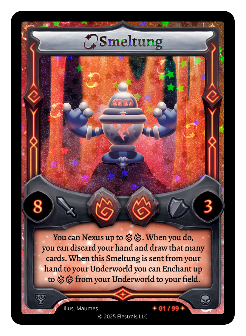 You can Nexus up to {FF}. When you do, you can discard your hand and draw that many cards. When this Smeltung is sent from your hand to the Underworld you can Enchant up to {FF} from your Underworld to your field.
